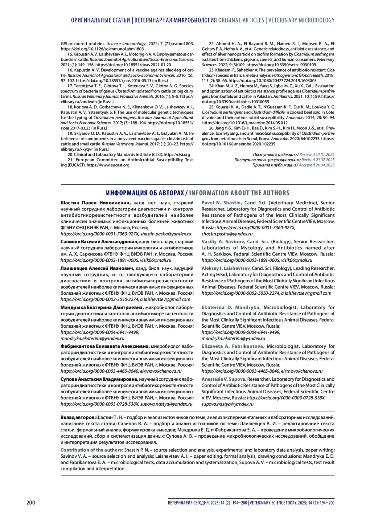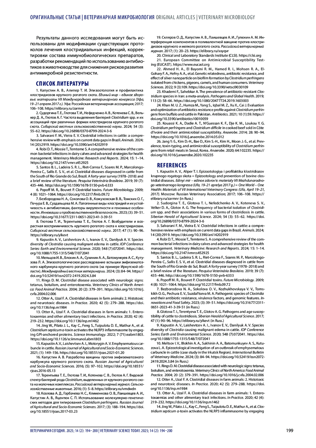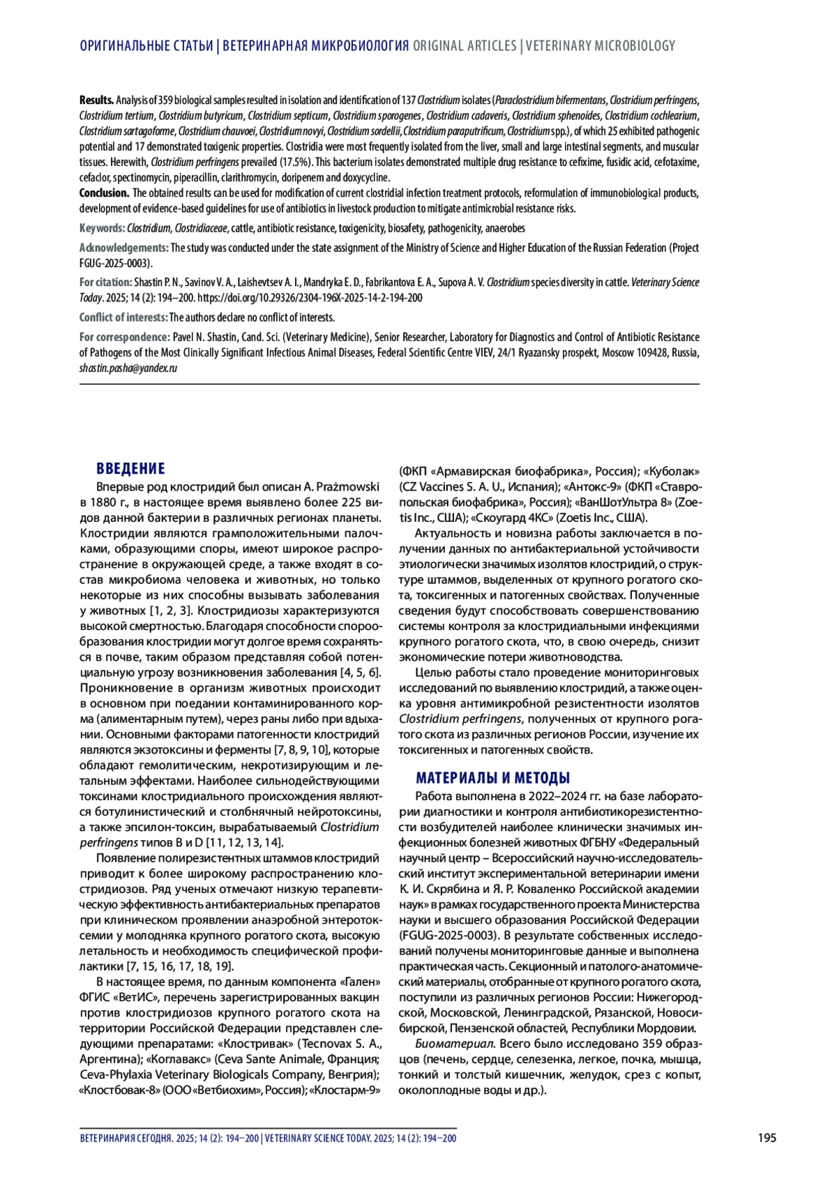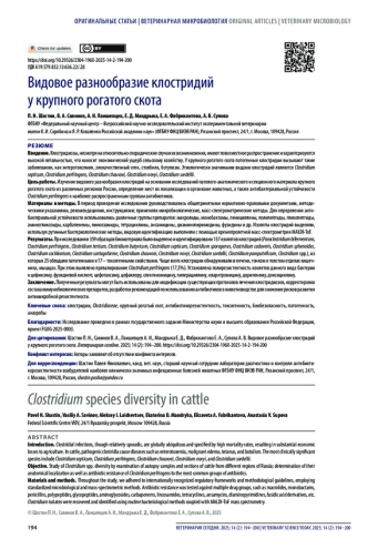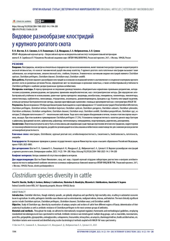 ШАСТИН П. Н., САВИНОВ В. А., ЛАИШЕВЦЕВ А. И., МАНДРЫКА Е. Д., ФАБРИКАНТОВА Е. А., СУПОВА А. В. ВИДОВОЕ РАЗНООБРАЗИЕ КЛОСТРИДИЙ У КРУПНОГО РОГАТОГО СКОТА // ВЕТЕРИНАРИЯ СЕГОДНЯ. 2025. № 2, ТОМ 14