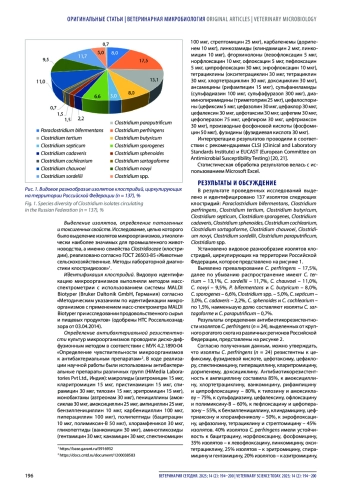 Материалы и методы. В период проведения исследования руководствовались общепринятыми нормативно-правовыми документами, методическими указаниями, рекомендациями, инструкциями; применяли микробиологические, масс-спектрометрические методы. Для определения антибактериальной устойчивости использовались различные группы препаратов: макролиды, монобактамы, пенициллины, полипептиды, гликопептиды, аминогликозиды, карбапенемы, линкозамиды, тетрациклины, ансамицины, диаминопиримидины, фузидины и др. Изоляты клостридий выделяли, используя рутинные бактериологические методы, видовую идентификацию выполняли с помощью времяпролетной масс-спектрометрии MALDI-ToF.