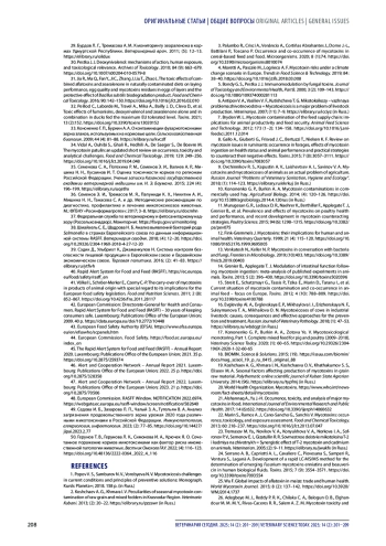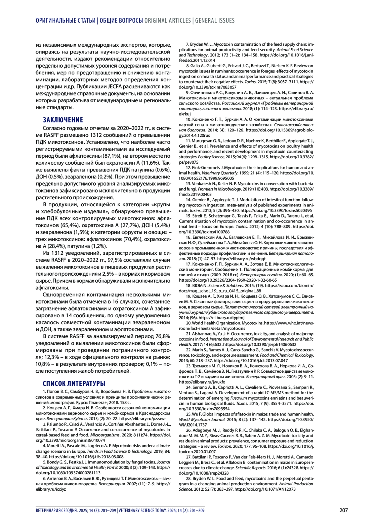 Заключение. Согласно отчетам RASFF и ACN за 2020–2022 гг., микотоксины представляли третью по распространенности категорию опасности. Нарушение законодательства в части превышения предельно допустимых концентраций микотоксинов выявлено исключительно в продукции растительного происхождения.