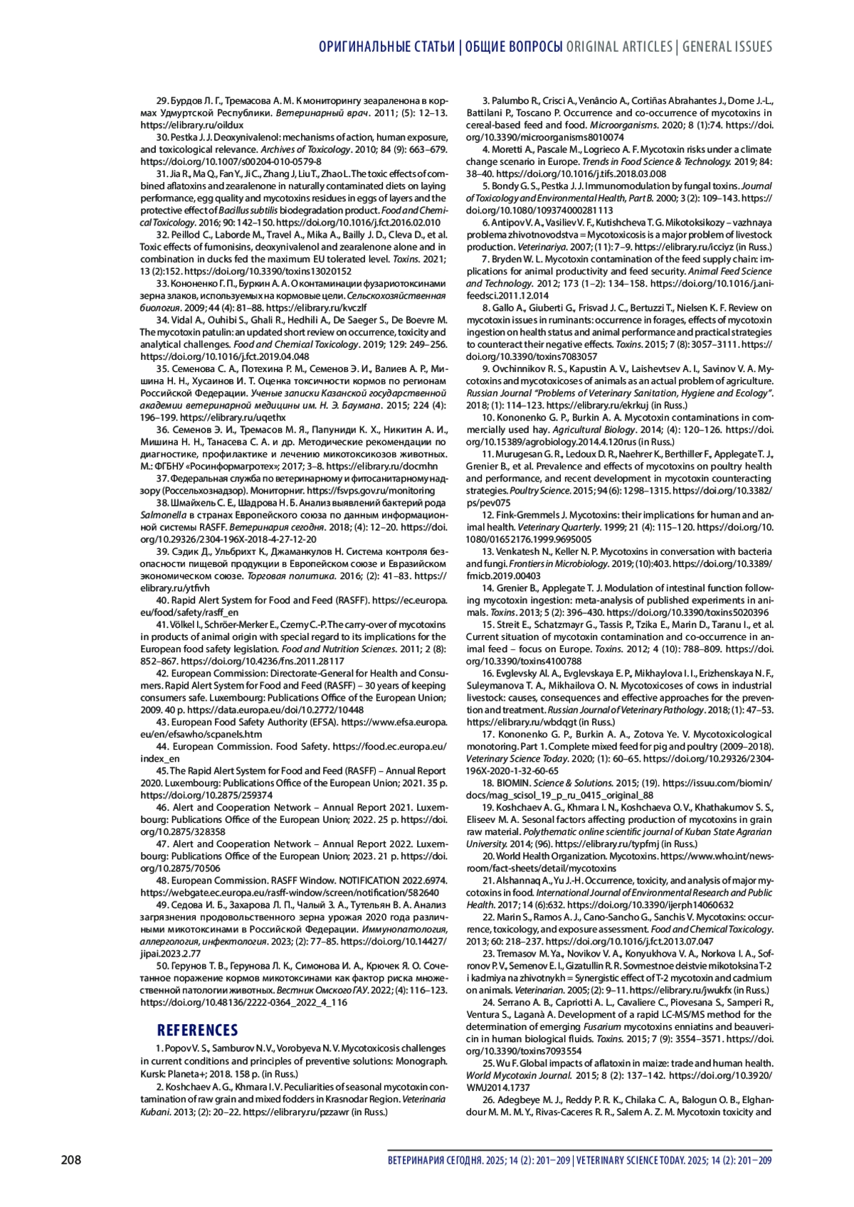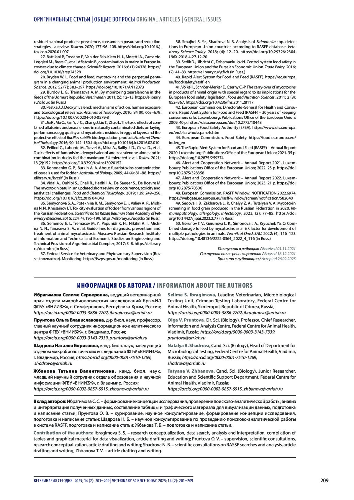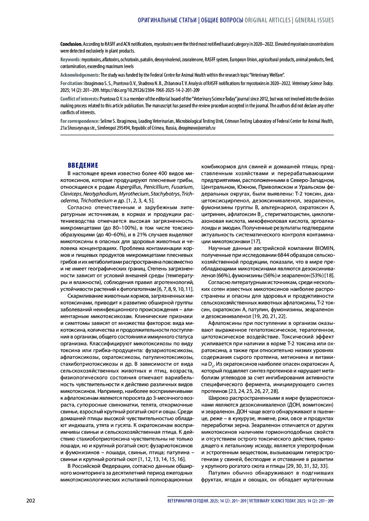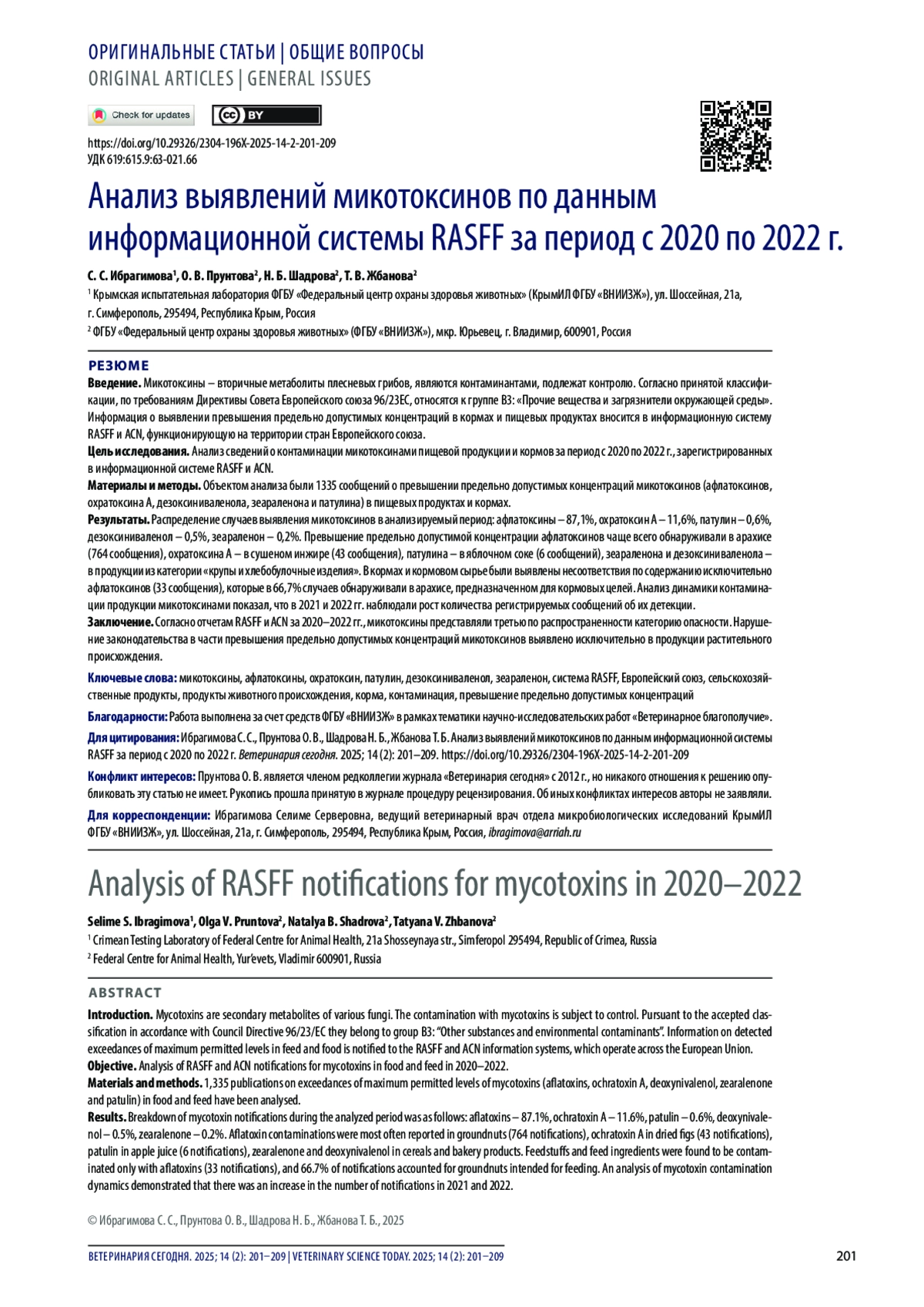 ИБРАГИМОВА С. С., ПРУНТОВА О. В., ШАДРОВА Н. Б., ЖБАНОВА Т. В. АНАЛИЗ ВЫЯВЛЕНИЙ МИКОТОКСИНОВ ПО ДАННЫМ ИНФОРМАЦИОННОЙ СИСТЕМЫ RASFF ЗА ПЕРИОД С 2020 ПО 2022 Г. // ВЕТЕРИНАРИЯ СЕГОДНЯ. 2025. № 2, ТОМ 14