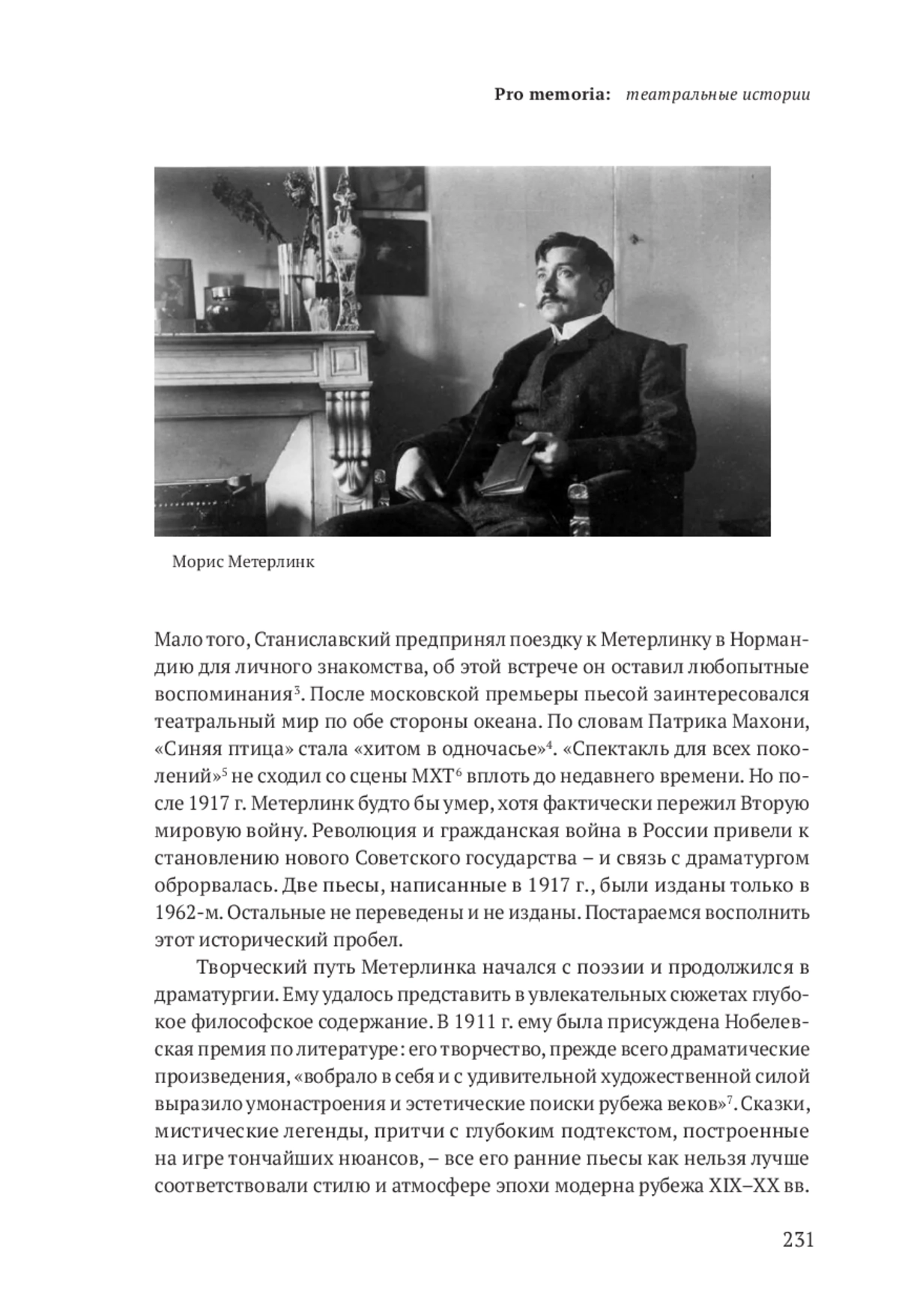 Мало того, Станиславский предпринял поездку к Метерлинку в Нормандию для личного знакомства, об этой встрече он оставил любопытные воспоминания 3. После московской премьеры пьесой заинтересовался театральный мир по обе стороны океана. По словам Патрика Махони, «Синяя птица» стала «хитом в одночасье»4. «Спектакль для всех поколений»5 не сходил со сцены МХТ 6 вплоть до недавнего времени. Но после 1917 г. Метерлинк будто бы умер, хотя фактически пережил Вторую мировую войну. Революция и гражданская война в России привели к становлению нового Советского государства – и связь с драматургом оброрвалась. Две пьесы, написанные в 1917 г., были изданы только в 1962-м. Остальные не переведены и не изданы. Постараемся восполнить этот исторический пробел.