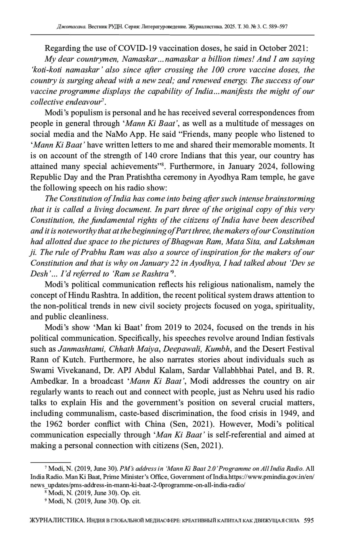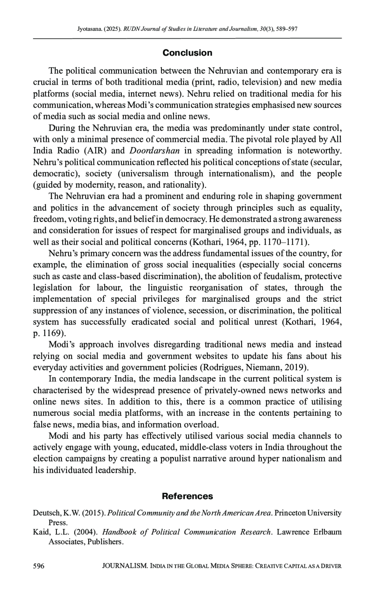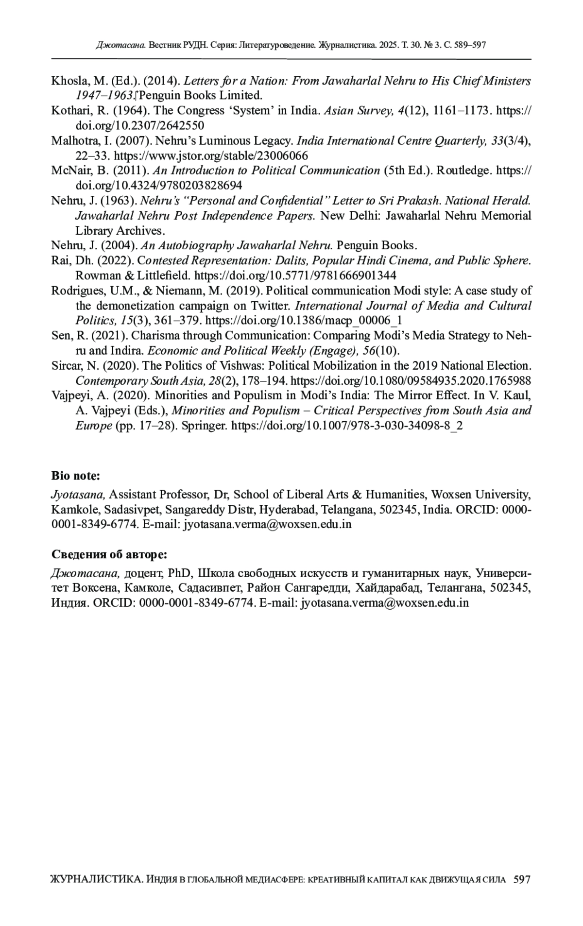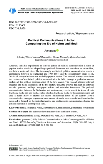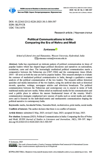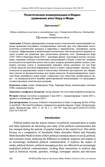 ДЖОТАСАНА Д. ПОЛИТИЧЕСКИЕ КОММУНИКАЦИИ В ИНДИИ: СРАВНЕНИЕ ЭПОХ НЕРУ И МОДИ // ВЕСТНИК РОССИЙСКОГО УНИВЕРСИТЕТА ДРУЖБЫ НАРОДОВ. СЕРИЯ: ЛИТЕРАТУРОВЕДЕНИЕ. ЖУРНАЛИСТИКА. 2025. ТОМ 30 № 3