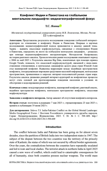 Представлены результаты исследования поведения глобальной интернет аудитории по отношению к конфликту Индии и Пакистана. Впервые в научных исследованиях медиагеографический подход применяется к анализу данной темы. Задача – выявить смысловые морфоскульптуры, связанные с отношениями Индии и Пакистана, определить их место на глобальном ментальном ландшафте, – решалась при помощи медиагеографического инструментария. Методология базировалась на теории рангового анализа. Хронологические рамки исследования охватывают период с 2004 по май 2025 г. Результаты анализа Big Data, извлеченных при помощи сервиса Google Trends, показали, что смысловой морфоскульптурой, связанной с индо-пакистанскими отношениями, в ментальных ландшафтах целого ряда стран Южной Азии стал кашмирский конфликт. Выявлены корреляции между медийным пространством конфликта, опосредованным мировыми средствами массовой информации, ментальным пространством, проявленным в запросах интернет-пользователей разных стран мира. Результаты анализа динамики реакций интернет-аудиторий на конфликтные процессы могут стать основой для прогнозирования поведения населения в условиях их обострения и моделирования решений.