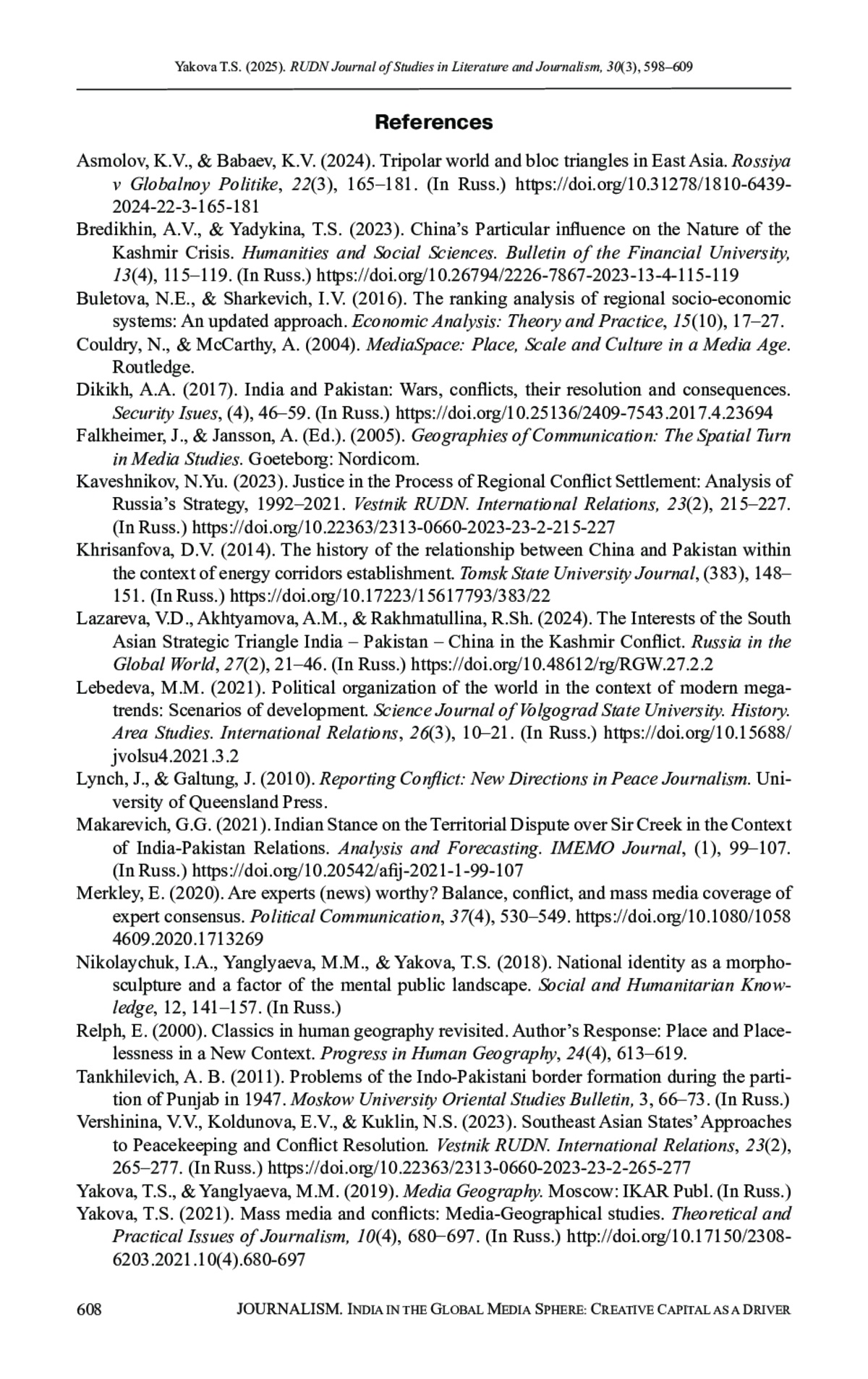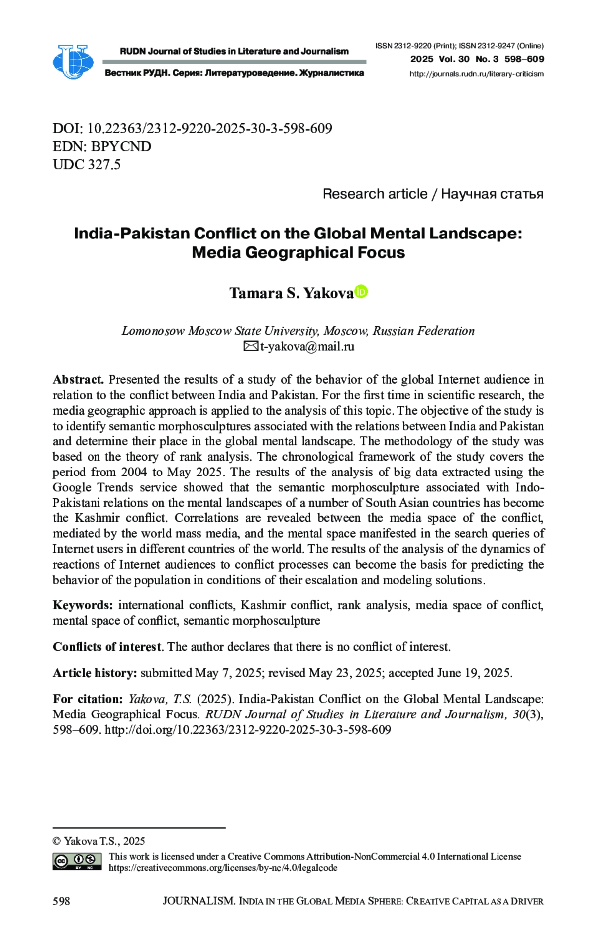 ЯКОВА Т. С. КОНФЛИКТ ИНДИИ И ПАКИСТАНА НА ГЛОБАЛЬНОМ МЕНТАЛЬНОМ ЛАНДШАФТЕ: МЕДИАГЕОГРАФИЧЕСКИЙ ФОКУС // ВЕСТНИК РОССИЙСКОГО УНИВЕРСИТЕТА ДРУЖБЫ НАРОДОВ. СЕРИЯ: ЛИТЕРАТУРОВЕДЕНИЕ. ЖУРНАЛИСТИКА. 2025. ТОМ 30 № 3