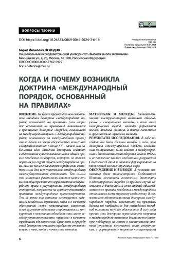 РЕЗУЛЬТАТЫ ИССЛЕДОВАНИЯ. В ходе исследования были сделаны выводы о том, что доктрина «Международный порядок, основанный на правилах» была введена в международный и дипломатический оборот в начале 1992 г., и ее появление явилось следствием разрушения Советского Союза и началом формирования на тот период моноцентричного мира.