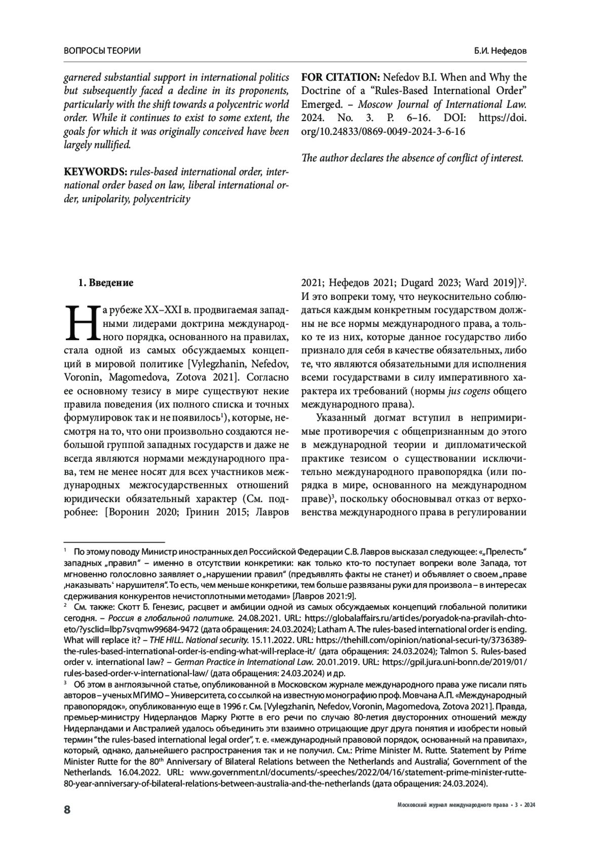 7. Нефедов Б.И. 2021. Понятие «правила» в доктрине «международного порядка, основанного на правилах». - Россия и современный мир. № 3. С. 6-21.
