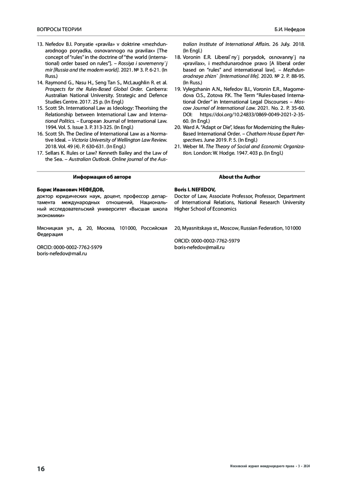 19. Vylegzhanin A.N., Nefedov B.I., Voronin E.R., Magomedova O.S., Zotova P.K. 2021. The Term “Rules-based International Order” in International Legal Discourses - Moscow Journal of International Law. No. 2. P. 35-60. https://doi.org/10.24833/0869-0049-2021-2-35-60 (In Engl.).