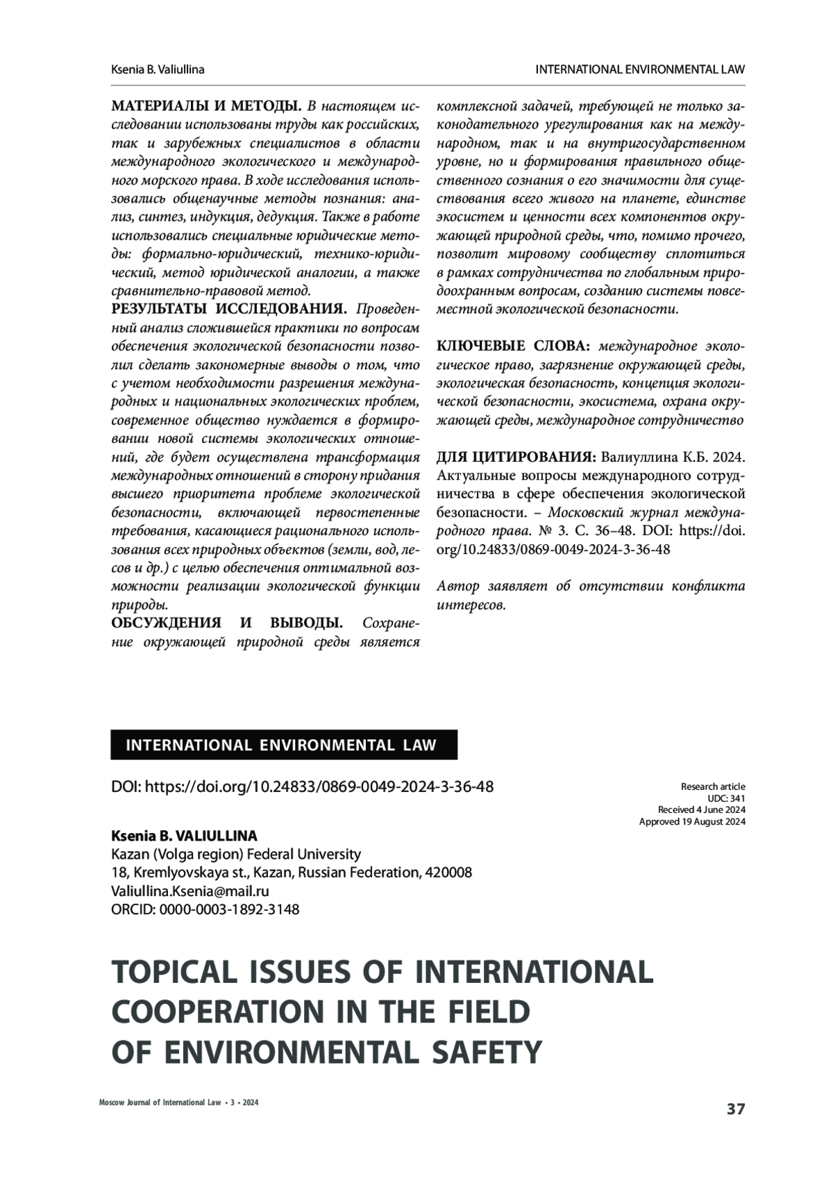 МАТЕРИАЛЫ И МЕТОДЫ. В настоящем исследовании использованы труды как российских, так и зарубежных специалистов в области международного экологического и международного морского права. В ходе исследования использовались общенаучные методы познания: анализ, синтез, индукция, дедукция. Также в работе использовались специальные юридические методы: формально-юридический, технико-юридический, метод юридической аналогии, а также сравнительно-правовой метод.