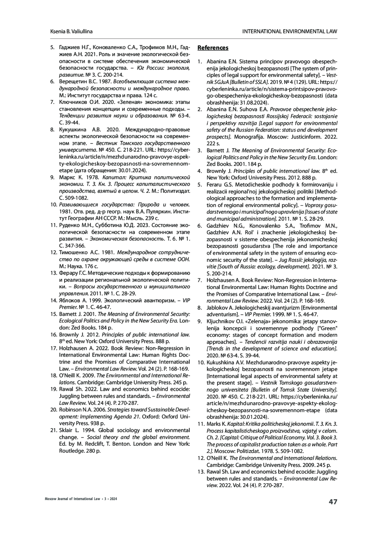 ВВЕДЕНИЕ. Проблемы экологического характера на сегодняшний день по степени причинения вреда окружающей природной среде и всему живому на планете невозможно сравнить с иными проблемами. В январе 1997 г. Генеральная Ассамблея Организации Объединенных Наций (ООН) в резолюции 15/157 призвала государства к принятию решительных мер в вопросах осуществления деятельность во всех направлениях исключительно в соответствии с нормами международного права, к реализации международно-правовых принципов и принятию мер по присоединению к многосторонним соглашениям в целях обеспечения развития международного права в целом и всех его отраслей. Большинство развитых государств взяли курс на обеспечение всеобъемлющей безопасности, которая возможна только в случае взятия четкого курса на охрану населения посредством комплекса мер социально-экономического, политического, а также природоохранного характера. Обеспечение экологической безопасности являет собой важнейшую часть проблемы безопасности существования государства в целом, разрешение которой на современном этапе развития общества становится таким же приоритетным направлением, как обеспечение военной и экономической безопасности. Экологическая безопасность есть совокупность состояний, процессов и явлений, обеспечивающих экологический баланс в окружающей природной среде, состояние защищенности всех компонентов природной среды, категория, направленная на то, чтобы максимально оградить все объекты природы и природные экосистемы от опасности (техногенной, биологической, радиационной, химической и пр.). Экологическая безопасность противостоит бесконтрольному экономическому росту, с которым столкнулось человечество, а также противоречиям между растущими потребностями общества и невозможностью биосферы их обеспечить. В связи с этим Генеральный секретарь ООН Антониу Гутерриш, выступая на Конференции по проблемам Мирового океана, справедливо подчеркнул неспособность общества улучшить то, значимость чего оно не может оценить. Сегодня, нет необходимости доказывать, что проблемы экологического характера по степени разрушительного воздействия и катастрофическим последствиям для всего живого и планеты в целом невозможно сравнить с проблемами иного характера. Стремительное увеличение численности населения, освоение новых плодородных территорий, экономический рост и все более интенсивное в связи с этим использование пространств и ресурсов Земли привели к серьезным и подчас необратимым последствиям, негативно влияющим на ее состояние.