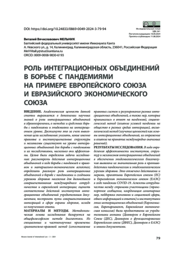 Статья: Роль интеграционных объединений в борьбе с пандемиями на примере Европейского союза и Евразийского экономического союза (2024)