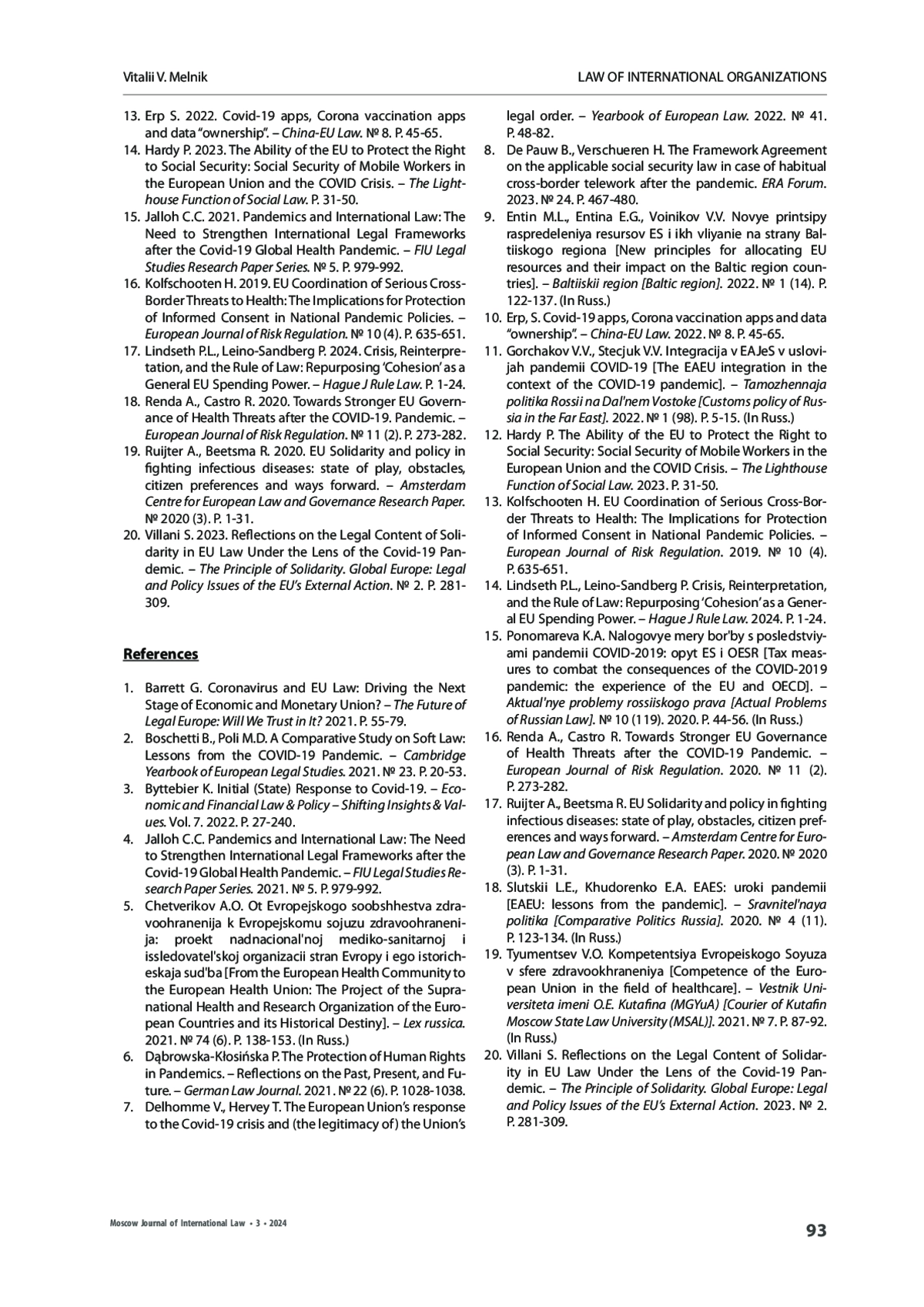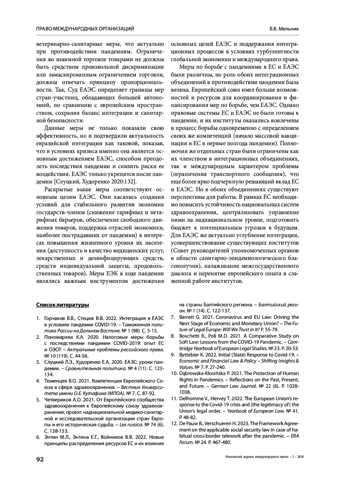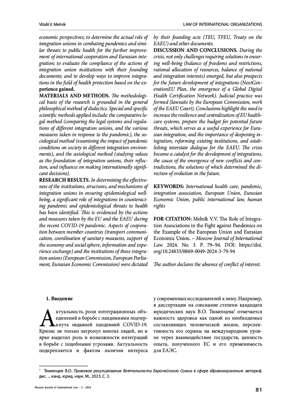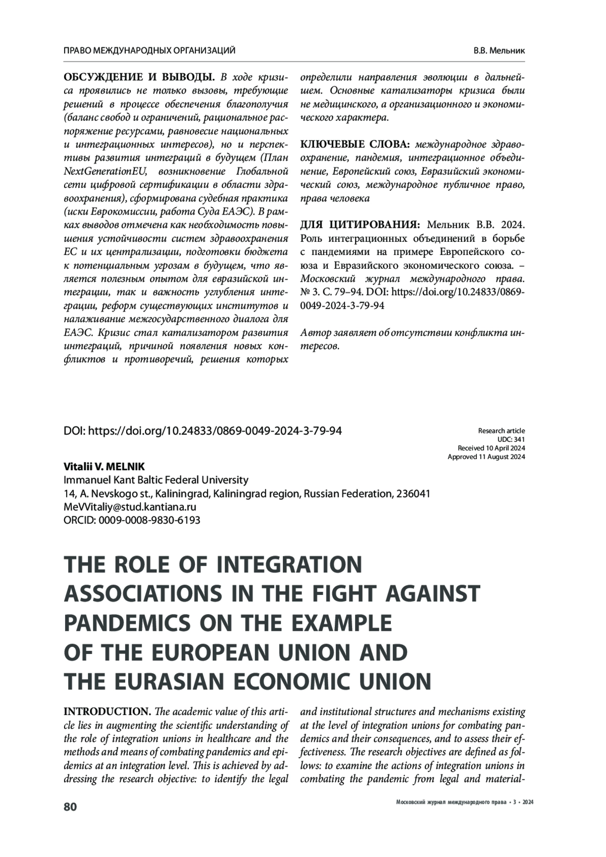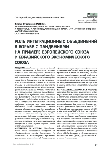 МЕЛЬНИК В. В. РОЛЬ ИНТЕГРАЦИОННЫХ ОБЪЕДИНЕНИЙ В БОРЬБЕ С ПАНДЕМИЯМИ НА ПРИМЕРЕ ЕВРОПЕЙСКОГО СОЮЗА И ЕВРАЗИЙСКОГО ЭКОНОМИЧЕСКОГО СОЮЗА // МОСКОВСКИЙ ЖУРНАЛ МЕЖДУНАРОДНОГО ПРАВА. 2024. ВЫПУСК 3