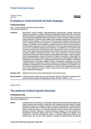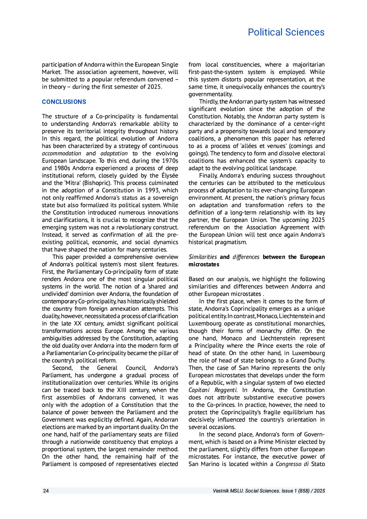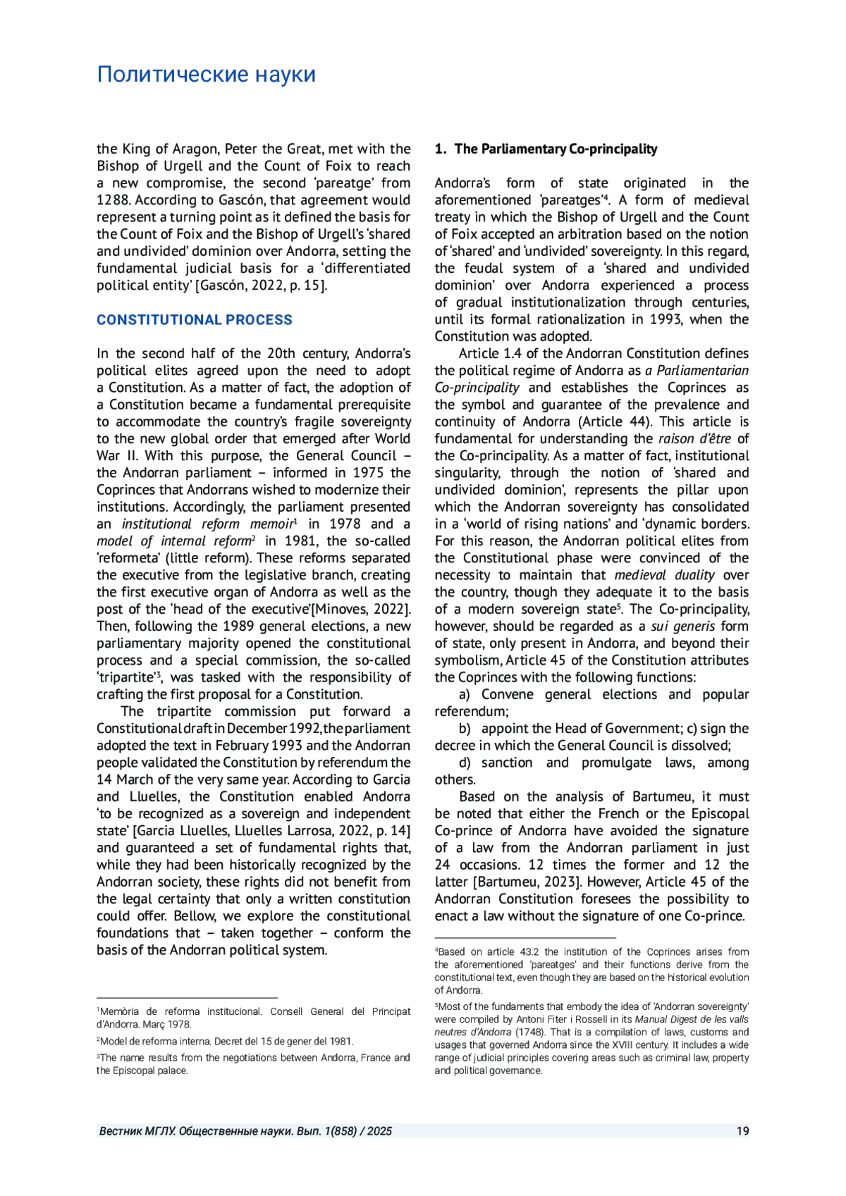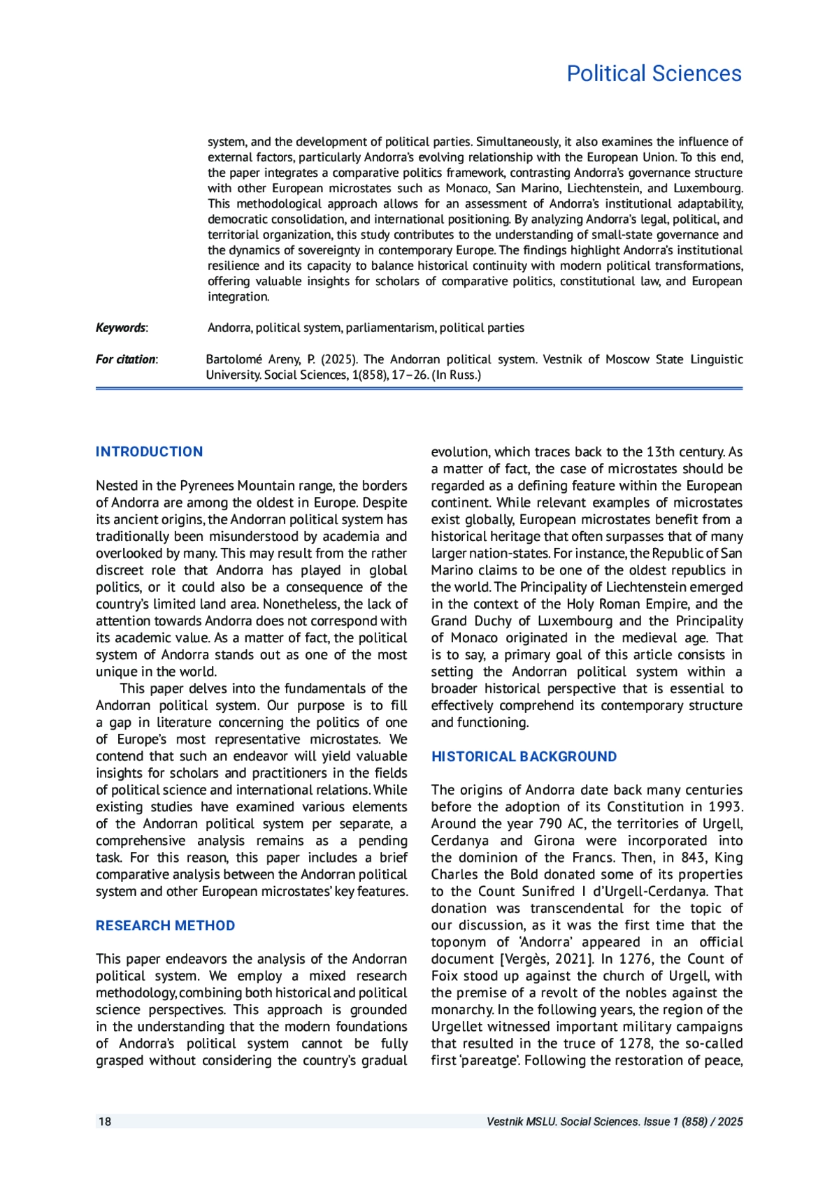 БАРТОЛОМЕ А. П. К ВОПРОСУ О ПОЛИТИЧЕСКОЙ СИСТЕМЕ АНДОРРЫ // ВЕСТНИК МОСКОВСКОГО ГОСУДАРСТВЕННОГО ЛИНГВИСТИЧЕСКОГО УНИВЕРСИТЕТА. ОБЩЕСТВЕННЫЕ НАУКИ. 2025. № 1 (858)