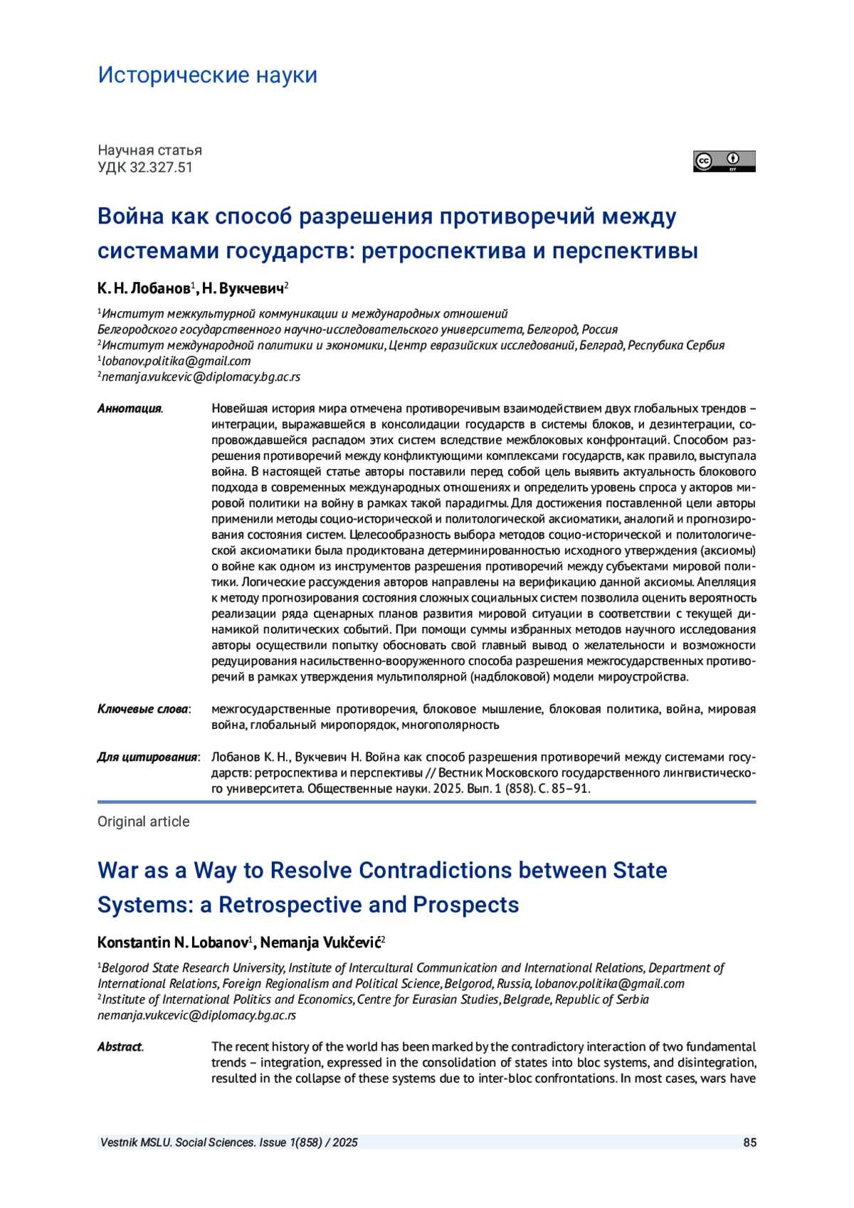 Новейшая история мира отмечена противоречивым взаимодействием двух глобальных трендов - интеграции, выражавшейся в консолидации государств в системы блоков, и дезинтеграции, сопровождавшейся распадом этих систем вследствие межблоковых конфронтаций. Способом разрешения противоречий между конфликтующими комплексами государств, как правило, выступала война. В настоящей статье авторы поставили перед собой цель выявить актуальность блокового подхода в современных международных отношениях и определить уровень спроса у акторов мировой политики на войну в рамках такой парадигмы. Для достижения поставленной цели авторы применили методы социо-исторической и политологической аксиоматики, аналогий и прогнозирования состояния систем. Целесообразность выбора методов социо-исторической и политологической аксиоматики была продиктована детерминированностью исходного утверждения (аксиомы) о войне как одном из инструментов разрешения противоречий между субъектами мировой политики. Логические рассуждения авторов направлены на верификацию данной аксиомы. Апелляция к методу прогнозирования состояния сложных социальных систем позволила оценить вероятность реализации ряда сценарных планов развития мировой ситуации в соответствии с текущей динамикой политических событий. При помощи суммы избранных методов научного исследования авторы осуществили попытку обосновать свой главный вывод о желательности и возможности редуцирования насильственно-вооруженного способа разрешения межгосударственных противоречий в рамках утверждения мультиполярной (надблоковой) модели мироустройства.