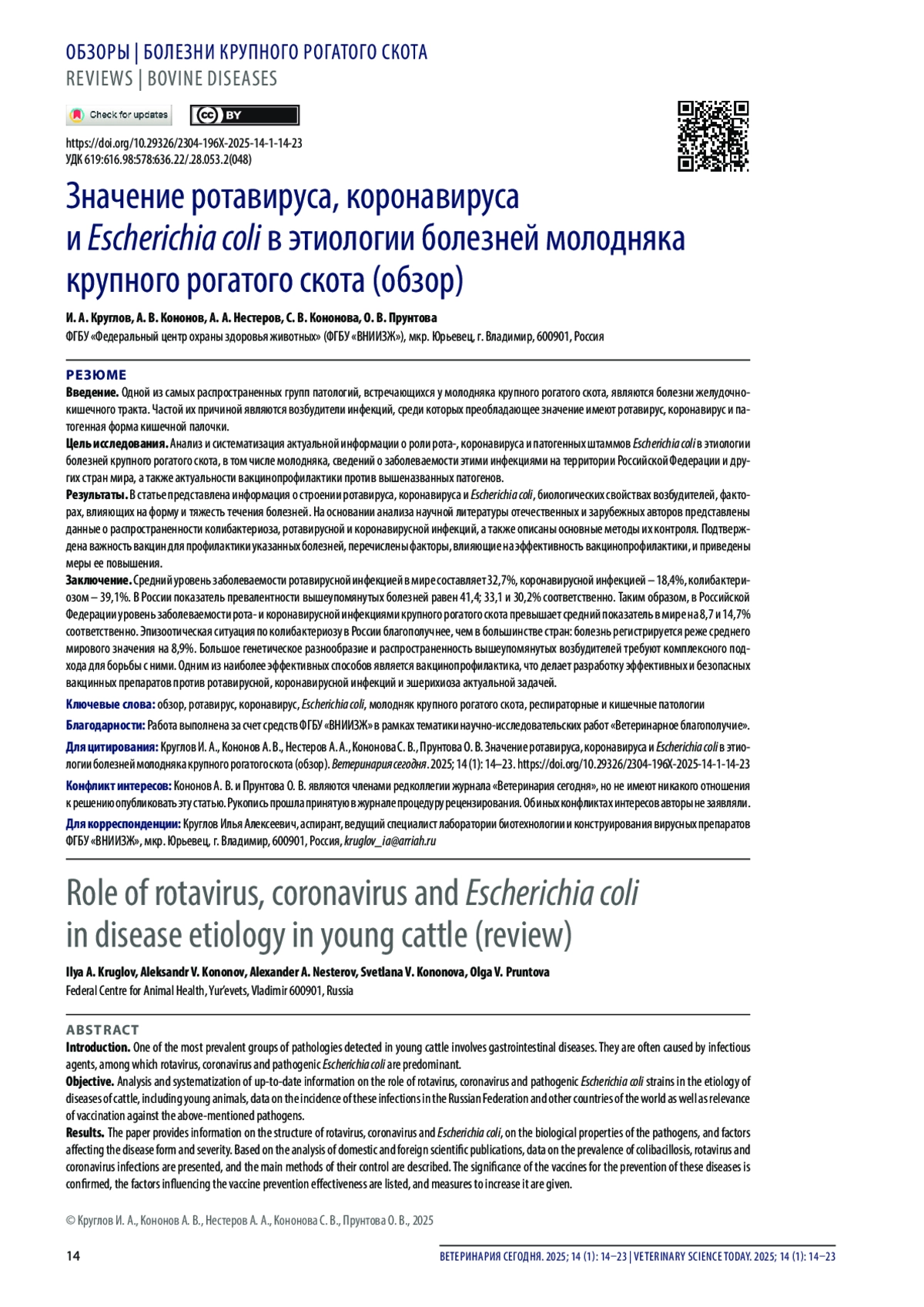 Цель исследования. Анализ и систематизация актуальной информации о роли рота-, коронавируса и патогенных штаммов Escherichia coli в этиологии болезней крупного рогатого скота, в том числе молодняка, сведений о заболеваемости этими инфекциями на территории Российской Федерации и других стран мира, а также актуальности вакцинопрофилактики против вышеназванных патогенов.