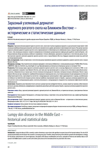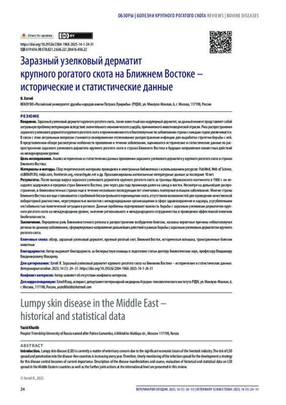ХАТИБ Я. ЗАРАЗНЫЙ УЗЕЛКОВЫЙ ДЕРМАТИТ КРУПНОГО РОГАТОГО СКОТА НА БЛИЖНЕМ ВОСТОКЕ – ИСТОРИЧЕСКИЕ И СТАТИСТИЧЕСКИЕ ДАННЫЕ // ВЕТЕРИНАРИЯ СЕГОДНЯ. 2025. № 1, ТОМ 14