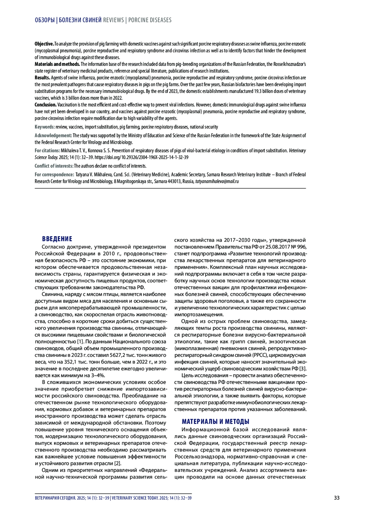 Введение. Свиноводство, как скороспелая отрасль животноводства, способно в короткие сроки добиться существенного увеличения производства свинины с высокими пищевыми свойствами и биологической полноценностью. Одной из острых проблем отрасли являются респираторные болезни вирусно-бактериальной этиологии. В сложившихся экономических условиях особое значение приобретает снижение технологической импортозависимости российского свиноводства, поэтому выпуск кормовых и ветеринарных препаратов отечественного производства необходимо рассматривать как важнейшее условие достижения технологического суверенитета Российской Федерации.