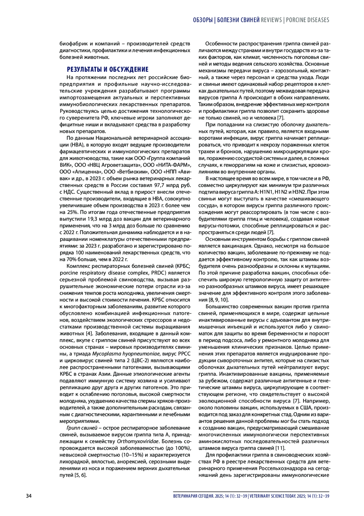 Результаты. Возбудители гриппа, энзоотической (микоплазменной) пневмонии, репродуктивно-респираторного синдрома, цирковирусной инфекции являются наиболее распространенными патогенами, которые вызывают респираторные болезни свиней на свиноводческих комплексах. На протяжении последних лет российские биофабрики разрабатывают программы импортозамещения необходимых иммунобиологических лекарственных препаратов. По итогам 2023 г. отечественные предприятия выпустили 19,3 млрд доз вакцин для ветеринарного применения, что на 3 млрд доз больше по сравнению с 2022 г.