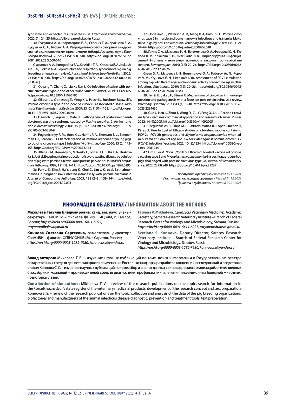 32. Gillespie J., Opriessnig T., Meng X. J., Pelzer K., Buechner-Maxwell V. Porcine circovirus type 2 and porcine circovirus-associated disease. Journal of Veterinary Internal Medicine. 2009; 23 (6): 1151-1163. DOI: 10.1111/j.1939-1676.2009.0389.x