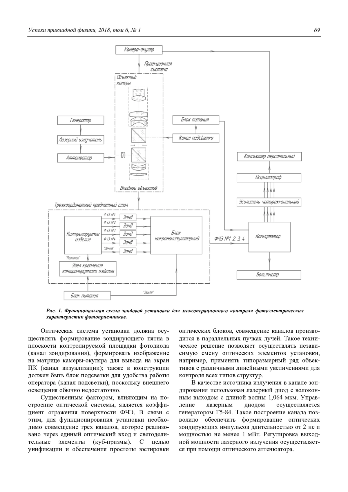 Приведены результаты разработки установки, предназначенной для межоперационного контроля фотоприемников и фотоприемных устройств на основе Si, Ge, InGaAs I-го поколения, предназначенных для приема лазерного излучения, на стадиях производства до резки пластины на отдельные фоточувствительные элементы. Установка позволяет проводить измерения темнового тока, токовой чувствительности, разброса чувствительности, коэффициента фотоэлектрической связи в нормальных климатических условиях.