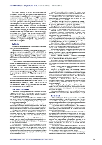 Заключение. Передача вируса высокопатогенного гриппа птиц млекопитающим разных видов, в том числе сельскохозяйственным животным, может дать старт будущей пандемии. Межвидовая передача вируса, регистрируемая в последнее время, указывает на возникновение адаптивных мутаций и представляет собой угрозу здоровью животных, общественному здравоохранению, продовольственной безопасности и биоразнообразию.