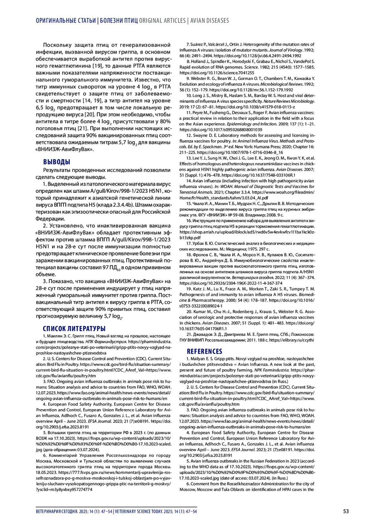 18. Фролов С. В., Чвала И. А., Мороз Н. В., Кулаков В. Ю., Сосипаторова В. Ю., Андрейчук Д. Б. Иммунобиологические свойства инактивированных вакцин против высокопатогенного гриппа птиц, изготовленных на основе антигенов штаммов вируса гриппа подтипа А/Н5Ж различной вирулентности. Ветеринария сегодня. 2022; 11 (4): 367-374. DOI: 10.29326/2304-196X-2022-11-4-367-374