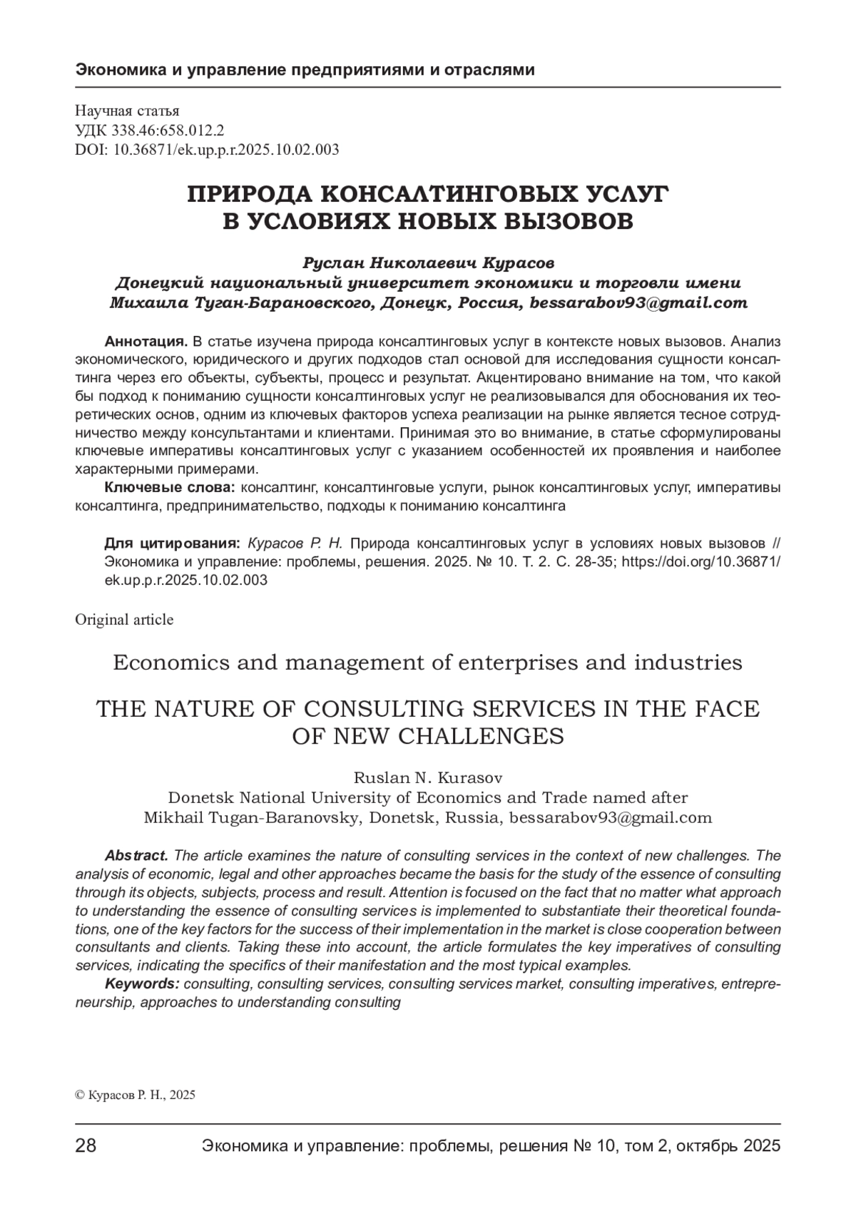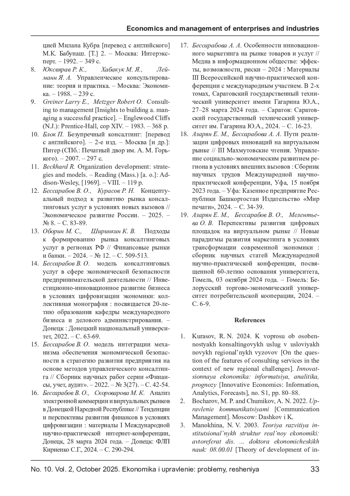 12. Бессарабов В. О., Курасов Р. Н. Концептуальный подход к развитию рынка консалтинговых услуг в условиях новых вызовов // Экономическое развитие России. - 2025. - № 8. - С. 83-89. EDN: EJFCWJ