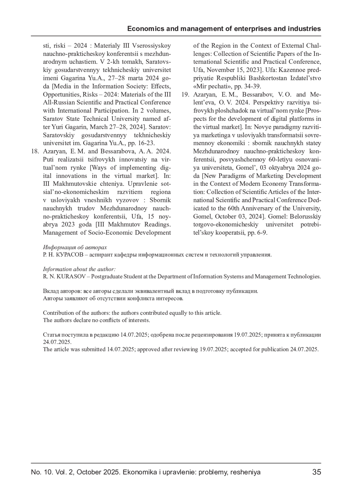 18. Азарян Е. М., Бессарабова А. А. Пути реализации цифровых инноваций на виртуальном рынке // III Махмутовские чтения. Управление социально-экономическим развитием региона в условиях внешних вызовов: Сборник научных трудов Международной научно-практической конференции, Уфа, 15 ноября 2023 года. - Уфа: Казенное предприятие Республики Башкортостан Издательство “Мир печати”, 2024. - С. 34-39. EDN: WKITJO