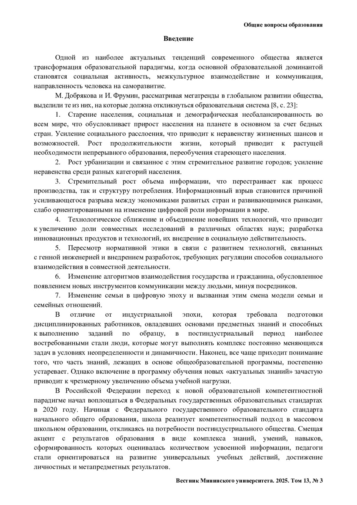 Обсуждение и заключения. Применение общенаучных методов анализа, обобщения и интеграции позволило составить целостную картину взаимосвязей между гибкими социальными навыками и кросс-функциональными компетенциями. Особое внимание было уделено рассмотрению подходов к интерпретации составляющих гибких социальных навыков. Такой подход имеет принципиальное значение для определения направления дальнейших исследований и разработки практических рекомендаций для образовательных организаций. Результаты исследования имеют прикладное значение для применения в образовательной практике, позволяя разработать эффективные методы и приемы, направленные на формирование и развитие гибких социальных навыков обучающихся.