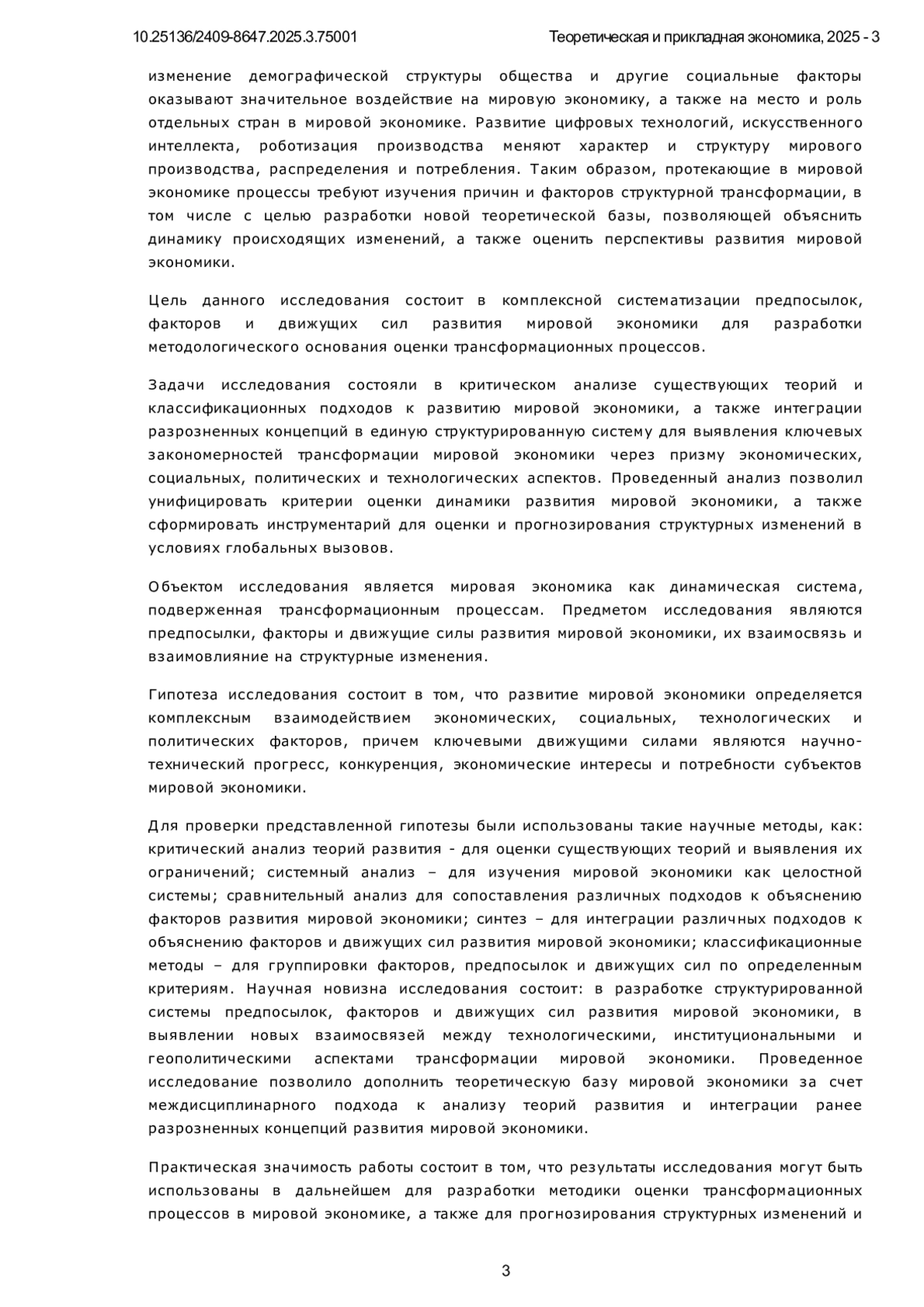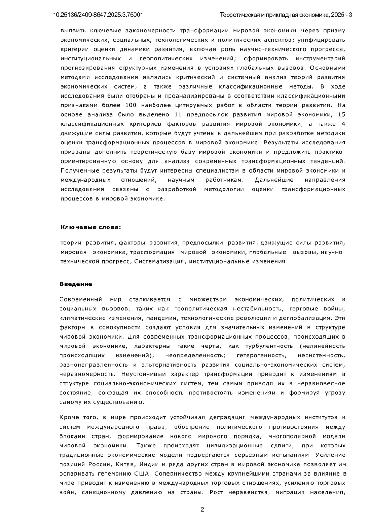 В научной литературе представлен широкий перечень исследований, посвященных теории развития мировой экономики. Вместе с тем устоявшейся теории развития мировой экономики до сих пор не существует. Развитие мировой экономики в теориях объясняется множеством отличных факторов и предпосылок. Цель данного исследования состоит в комплексной систематизации предпосылок, факторов и движущих сил развития мировой экономики для разработки методологической основы оценки трансформационных процессов. Статья посвящена изучению предпосылок, факторов и движущих сил развития мировой экономики. Критический анализ существующих теорий и классификационных подходов позволил интегрировать разрозненные концепции в единую структурированную систему, которая позволяет: выявить ключевые закономерности трансформации мировой экономики через призму экономических, социальных, технологических и политических аспектов; унифицировать критерии оценки динамики развития, включая роль научно-технического прогресса, институциональных и геополитических изменений; сформировать инструментарий прогнозирования структурных изменения в условиях глобальных вызовов. О сновными методами исследования являлись критический и системный анализ теорий развития экономических систем, а также различные классификационные методы. В ходе исследования были отобраны и проанализированы в соответствии классификационными признаками более 100 наиболее цитируемых работ в области теории развития. На основе анализа было выделено 11 предпосылок развития мировой экономики, 15 классификационных критериев факторов развития мировой экономики, а также 4 движущие силы развития, которые будут учтены в дальнейшем при разработке методики оценки трансформационных процессов в мировой экономике. Р езультаты исследования призваны дополнить теоретическую базу мировой экономики и предложить практикоориентированную основу для анализа современных трансформационных тенденций. Полученные результаты будут интересны специалистам в области мировой экономики и международных отношений, научным работникам. Дальнейшие направления исследования связаны с разработкой методологии оценки трансформационных процессов в мировой экономике