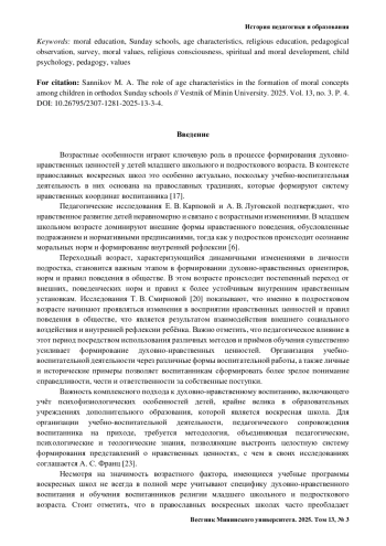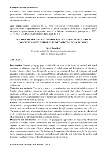Введение. Современная педагогика уделяет значительное внимание вопросам духовно-нравственного воспитания детей, особенно в условиях глобализации и цифровизации образования. Воскресные школы, являющиеся исторически устоявшейся формой обучения религии и духовно-нравственного воспитания на приходах Русской Православной Церкви, выполняют важную роль в формировании у учащихся представлений о нравственных ценностях, однако влияние возрастных особенностей на этот процесс остаётся недостаточно изученным. Настоящее педагогическое исследование направлено на выявление педагогических условий, способствующих эффективному формированию и развитию нравственных представлений у детей младшего и подросткового возраста.