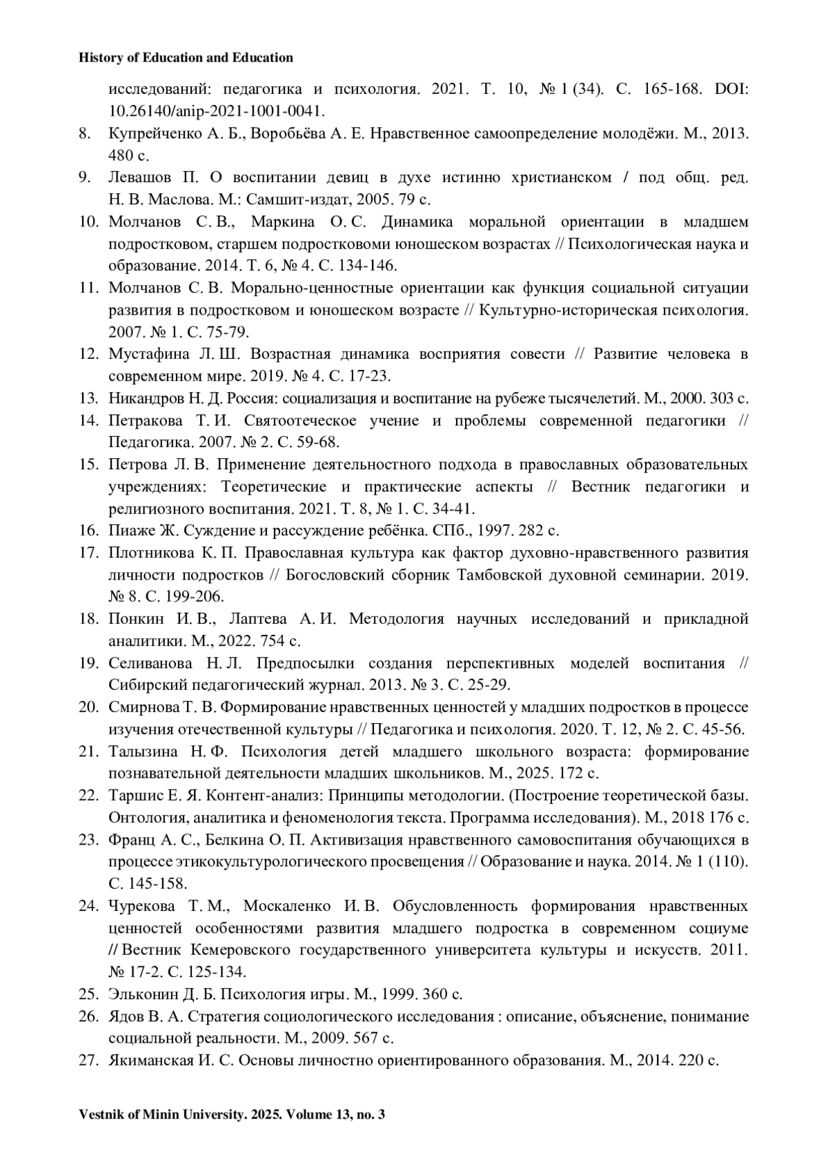 20. Смирнова Т. В. Формирование нравственных ценностей у младших подростков в процессе изучения отечественной культуры // Педагогика и психология. 2020. Т. 12, № 2. С. 45-56.