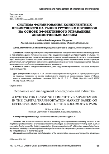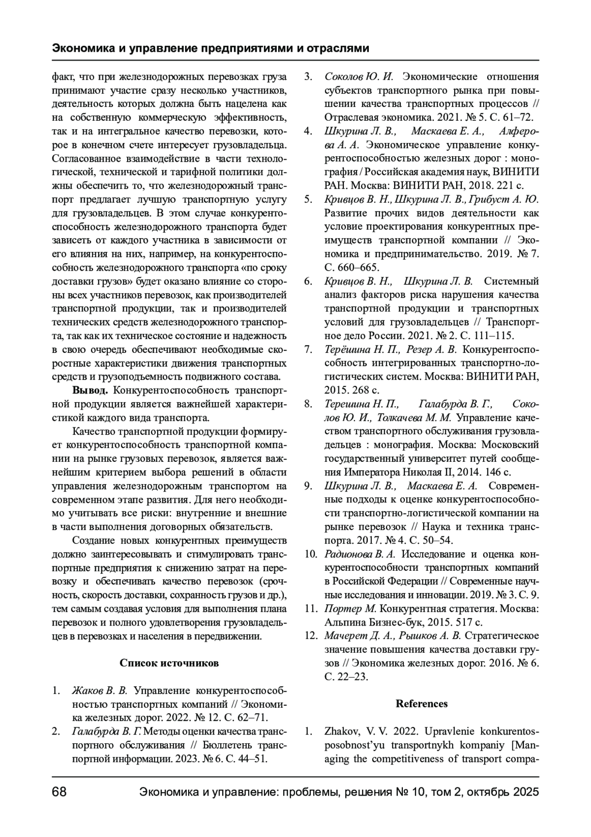 1. Жаков В. В. Управление конкурентоспособностью транспортных компаний // Экономика железных дорог. 2022. № 12. С. 62-71. EDN: CWHAXJ