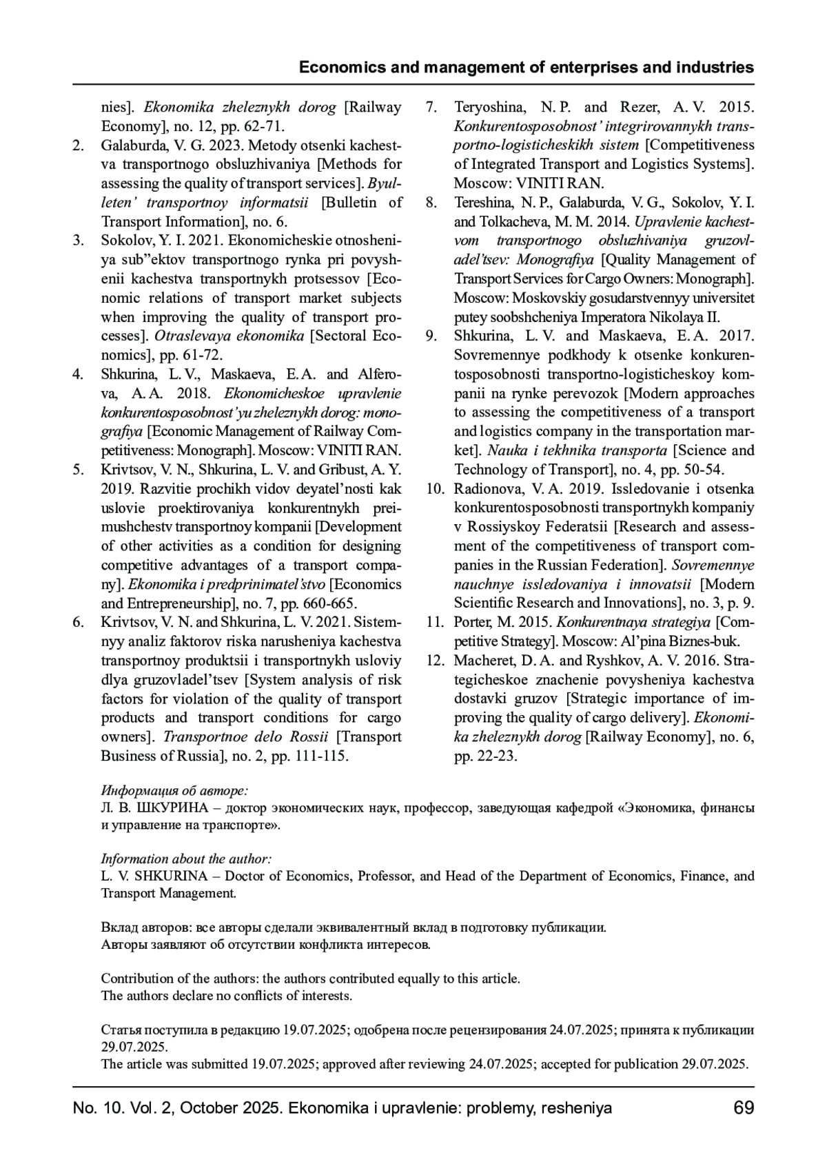 2. Галабурда В. Г. Методы оценки качества транспортного обслуживания // Бюллетень транспортной информации. 2023. № 6. С. 44-51.