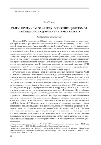 Публикуемая статья связана с одним из самых заметных недавних проектов MGH и в немногих штрихах характеризует положение дел с публикацией средневековых источников и задачи современной археографии. Автор статьи Т. Кёльцер – немецкий историк, дипломат, публикатор средневековых грамот, специалист в области вспомогательных исторических дисциплин, истории государства, права и церкви различных регионов средневековой Европы. Выпускник университета Гиссена (1976), ученик крупного медиевиста Карлрихарда Брюля (1925–1997), под руководством которого Т. Кёльцером были защищены диссертации о картулярии монастыря Фарфа конца XI в. с публикацией источника (1982) и средневековых подделках грамот в монастыре Санкт-Максимин у Трира (1987). Преподавательская работа Т. Кёльцера долгое время (в 1992–2015 гг.) была связана с университетом Бонна, почетным профессором которого он является. В разное время преподавал также в Гиссене, Гейдельберге, Марбурге, читал лекции в Принстоне (США). Заслугой Т. Кёльцера является сохранение и укрепление в университетском образовании Германии классических вспомогательных исторических дисциплин и архивного дела, под его руководством защищено более 20 диссертаций. Для Т. Кёльцера и его учеников в центре исследовательских приоритетов неизменно стоит исторический источник, поэтому дипломатика и другие вспомогательные исторические дисциплины выступают в их трудах ключевыми направлениями, а публикация текстов является итоговым результатом работы2.