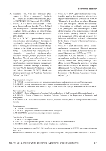 12. Сенько А. Н. Управленческие аспекты обеспечения экономической безопасности организаций в цифровой среде // Структурные и институциональные трансформации в экономике и управлении: Международные научные чтения памяти профессора Ю.М. Ясинского: Сборник материалов, Минск, 29 ноября 2022 года. - Минск: Академия управления при Президенте Республики Беларусь, 2023. - С. 118-122. EDN: XTTQLW