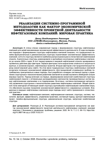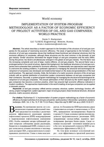 В статье описан современный подход к формированию структуры нефтегазовых компаний для целей максимизации экономической эффективности деятельности. В ходе исследования подходов к формированию структуры нефтегазовых компаний показано, что традиционные линейно-функциональные и дивизиональные структуры ограничивают экономическую эффективность компаний, хотя эти структуры являются наиболее распространенными в отечественной нефтегазовой отрасли. Аналогичные структуры доминировали в крупнейших иностранных нефтегазовых компаниях до начала 2000-х годов. В этот период времени в мировой нефтегазовой отрасли одновременно проявилось действие двух факторов. Первым фактором стало возрастание сложности и затратности крупных, в основном морских, нефтегазовых проектов. Вторым фактором стал продолжительный период низкой мировой цены нефти. На этом фоне традиционные структуры нефтегазовых компаний исчерпали потенциал экономической эффективности. Для преодолений сложившихся проблем потребовались принципиально новые подходы. Был разработан и внедрен системный подход к управлению структурным и технологическим развитием компаний на основе изучения и обобщения лучших мировых практик. Подход включает, во-первых, формирование матричной хозяйственной структуры нефтегазовой отрасли с оптимальным распределением компонентов производственных систем между нефтегазовыми компаниями и их подрядчиками. Во-вторых, системно-программную методологию управления структурным и технологическим развитием нефтегазовых компаний. Общей практикой стала ежегодная оптимизация своей структуры крупнейшими нефтегазовыми компаниями мира, что обеспечило высокие показатели экономической эффективности в современных условиях. Внедренные в ведущих нефтегазовых компаниях мира подходы могут найти применение в отечественной практике.