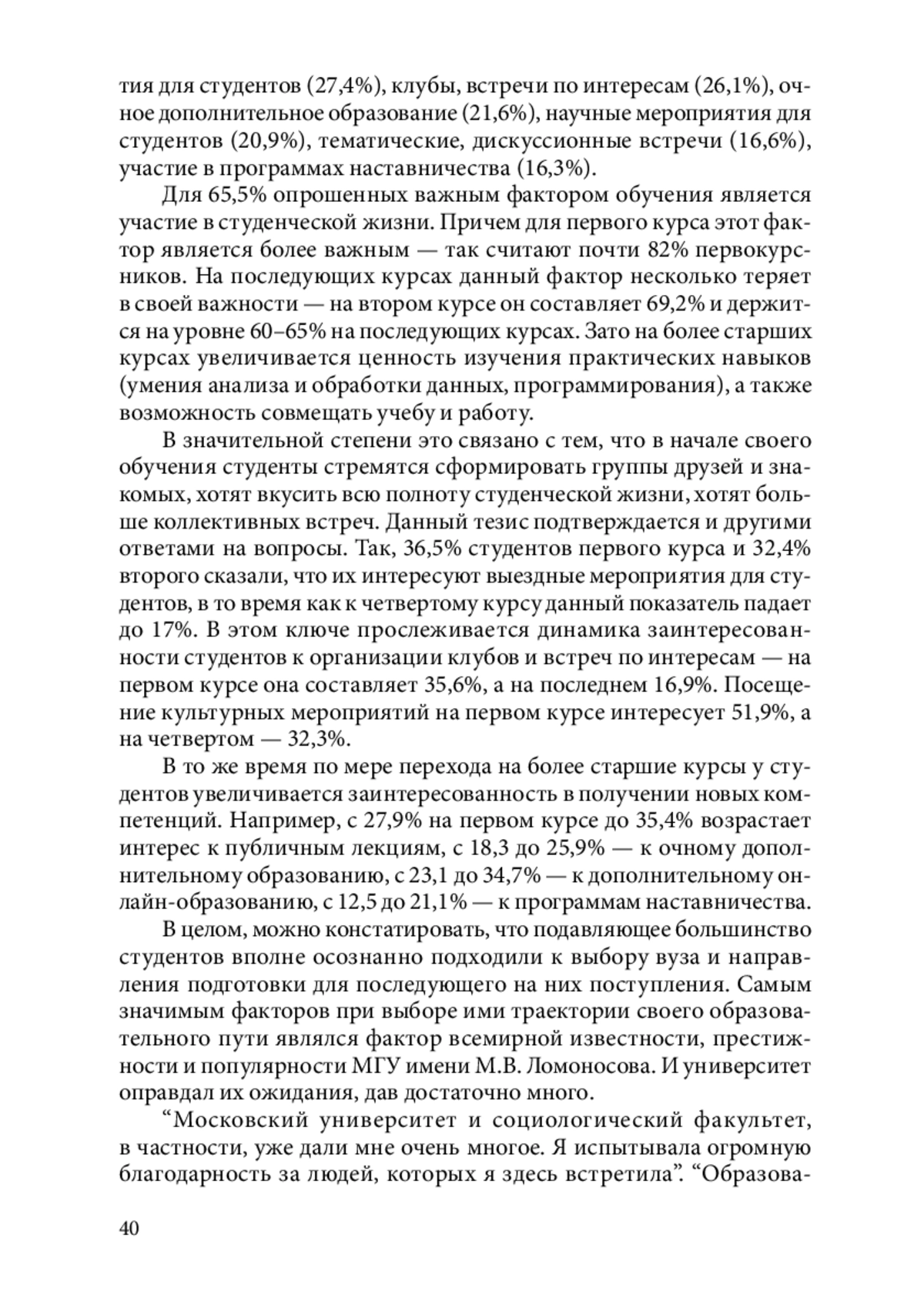 Данная статья подготовлена коллективом авторов социологического факультета МГУ имени М. В. Ломоносова в рамках подготовки к 270-летию Московского университета. В основу статьи легли обработанные и проанализированные данные социологического исследования “МГУ глазами студентов социологического факультета”, проведённого сотрудниками социологического факультета МГУ имени М. В. Ломоносова в декабре 2023 года. В рамках исследования опрошено в общей сложности 679 студентов. В дополнение к количественной составляющей, важной частью исследования стал анализ эссе студентов, в которых они описывали свои впечатления от поступления и обучения в МГУ. Цель исследования заключалась в том, чтобы на базе анализа мнений студентов о критериях выбора вуза для получения высшего образования, о различных аспектах собственно образовательного процесса и перспективах трудоустройства, создать целостное представление об отношении обучающихся к Московскому университету, о его миссии в развитии России и российской науки, а также об их собственных жизненных траекториях. В рамках исследования было изучено мнение студентов относительно определяющих факторов при выборе ими вуза для поступления, проанализированы причины, которые способствовали их выбору непосредственно Московского университета в качестве места для получения высшего образования. Была показана взаимосвязь между выбором студентами Московского университета и опытом обучения в МГУ их родственников или друзей, проранжирована значимость элементов университетской жизни, в том числе внеучебной деятельности, имеющих наибольшее значение для студентов. Отдельно в статье были рассмотрены вопросы, связанные с трудоустройством выпускников и ожиданиями от будущей профессии.
