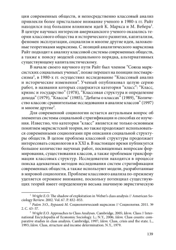 Данная статья посвящена творчеству американского ученого Эрика Олина Райта. Актуальность статьи обусловлена изменениями системы социальной стратификации, происходящими в современных обществах, а также многочисленными попытками ученых разработать релевантные подходы для изучения социальной структуры. Американский социолог исследовал проблемы трансформации классовой структуры, что отражено в большом количестве его научных публикаций. Его видение системы социальной стратификации современных обществ отличается оригинальностью и основано на большом фактическом материале. Для Райта интерес представляло не только американское общество, он участвовал в международных сравнительных исследованиях, а также посещал Россию и Украину с целью изучения социальной структуры. В статье рассматриваются основные положения классовой теории Э. О. Райта. Американский социолог последовательно продвигается в своем анализе от категорий «класс» и «эксплуатация» к исследованию новых средних классов и к созданию собственной целостной теории противоречивых классовых позиций. Автор статьи предприняла попытку проследить исследовательскую логику известного американского социолога, а также показать его успехи в осуществлении точного и подробного пересмотра различных классовых теорий, и с учетом собственных эмпирических исследований выстроить одну из самых популярных в современной науке классовых теорий.