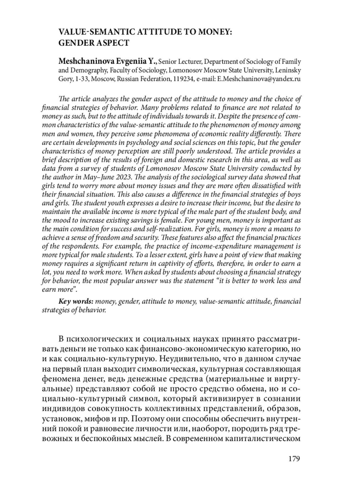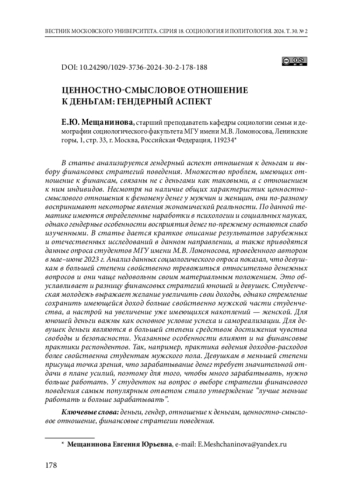 МЕЩАНИНОВА Е. Ю. ЦЕННОСТНО-СМЫСЛОВОЕ ОТНОШЕНИЕ К ДЕНЬГАМ: ГЕНДЕРНЫЙ АСПЕКТ // ВЕСТНИК МОСКОВСКОГО УНИВЕРСИТЕТА. СЕРИЯ 18. СОЦИОЛОГИЯ И ПОЛИТОЛОГИЯ. 2024. ТОМ 30 № 2