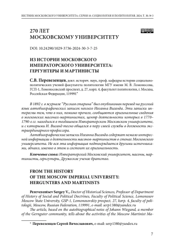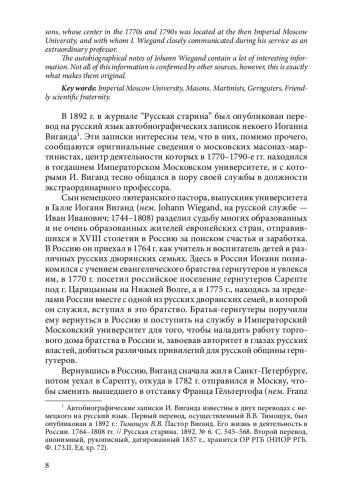 В 1892 г. в журнале “Русская старина” был опубликован перевод на русский язык автобиографических записок некоего Иоганна Виганда. Эти записки интересны тем, что в них, помимо прочего, сообщаются оригинальные сведения о московских масонах-мартинистах, центр деятельности которых в 1770–1790-е гг. находился в тогдашнем Императорском Московском университете, и с которыми И. Виганд тесно общался в пору своей службы в должности экстраординарного профессора.