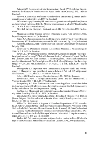 8. К истории масонства в России. Перевод с немецкой неизданной рукописи // Рус-ская старина. 1882. № 9. С. 533-560.