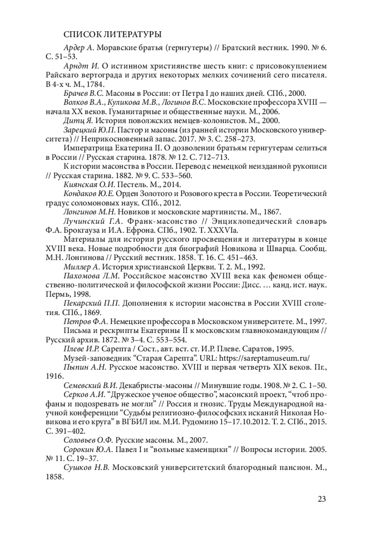23. Серков А.И. “Дружеское ученое общество”, масонский проект, “чтоб профаны и подозревать не могли” // Россия и гнозис. Труды Международной научной конференции “Судьбы религиозно-философских исканий Николая Новикова и его круга” в ВГБИЛ им. М.И. Рудомино 15-17.10.2012. Т. 2. СПб., 2015. С. 391-402.
