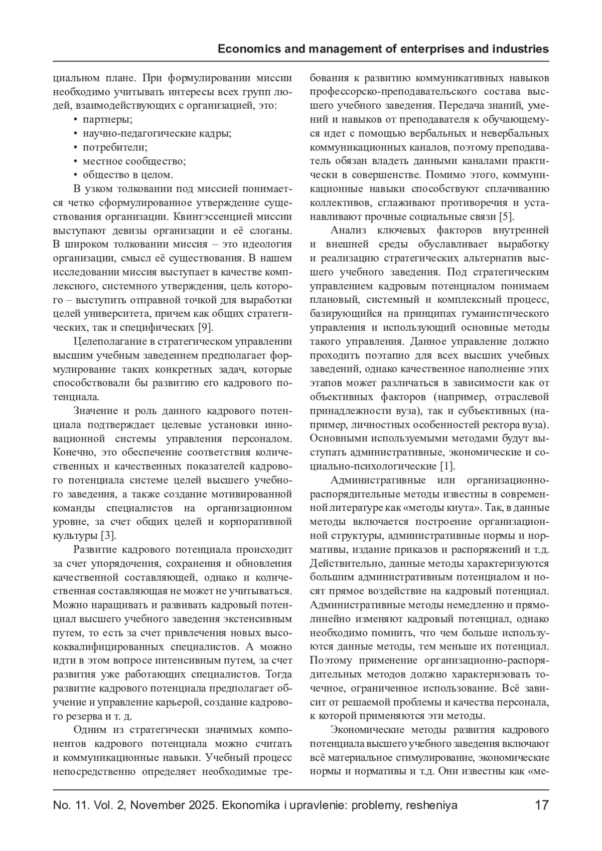 3. Бездудная А. Г., Иванов Е. Д. Управление кадровым потенциалом высшего учебного заведения // Лидерство и менеджмент. - 2025. - № 5. - Т. 12. - С. 1179-1193. EDN: LIEYFS