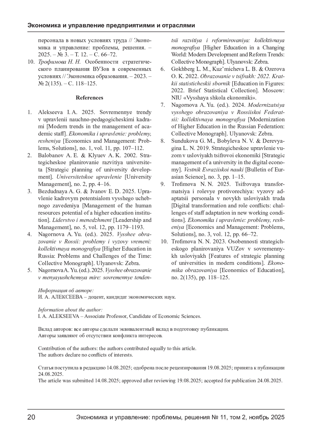 1. Алексеева И. А. Современные тренды в управлении научно-педагогическими кадрами // Экономика и управление: проблемы, решения. - 2025. - № 1. - Т. 11. - С. 107-112. EDN: CICBPW