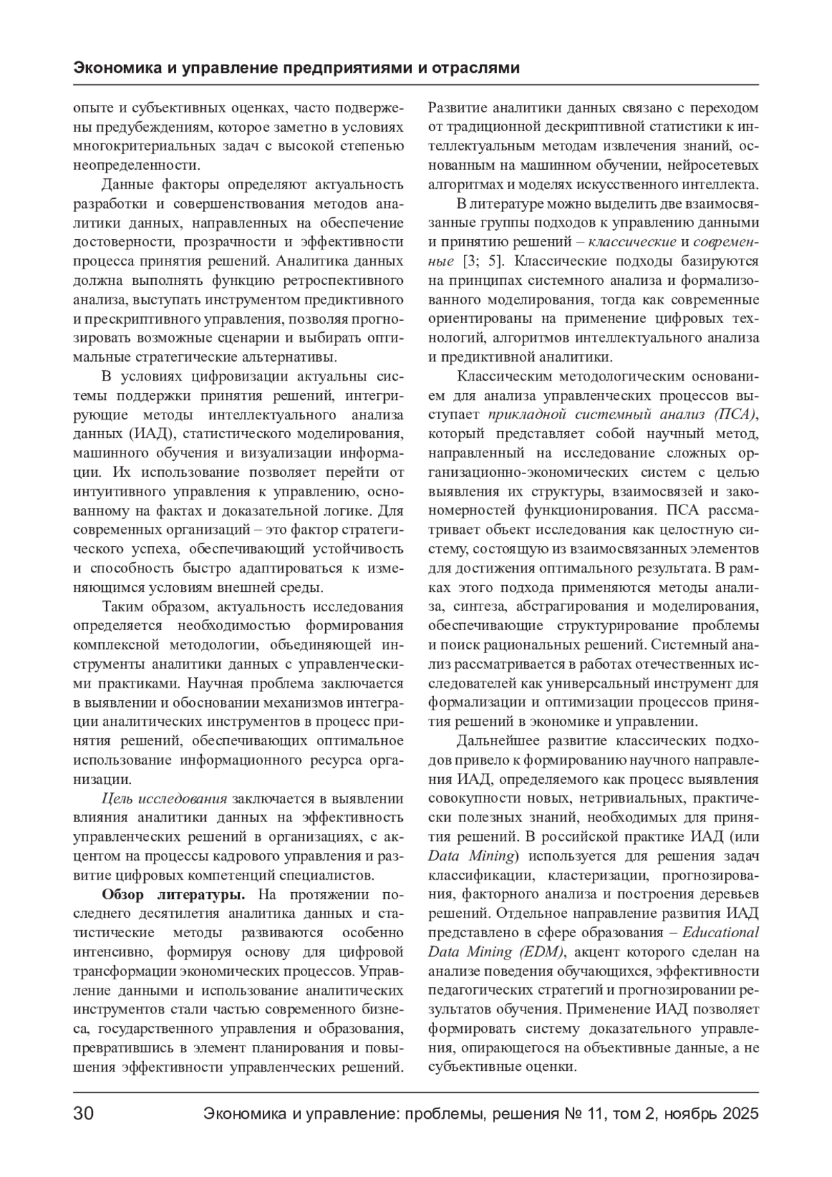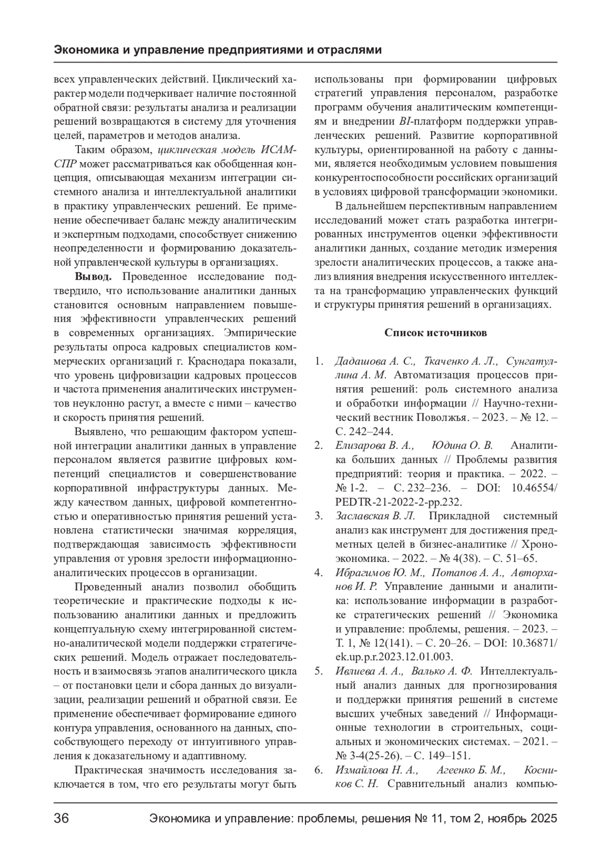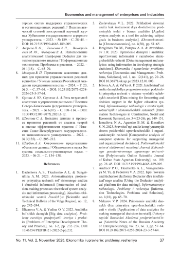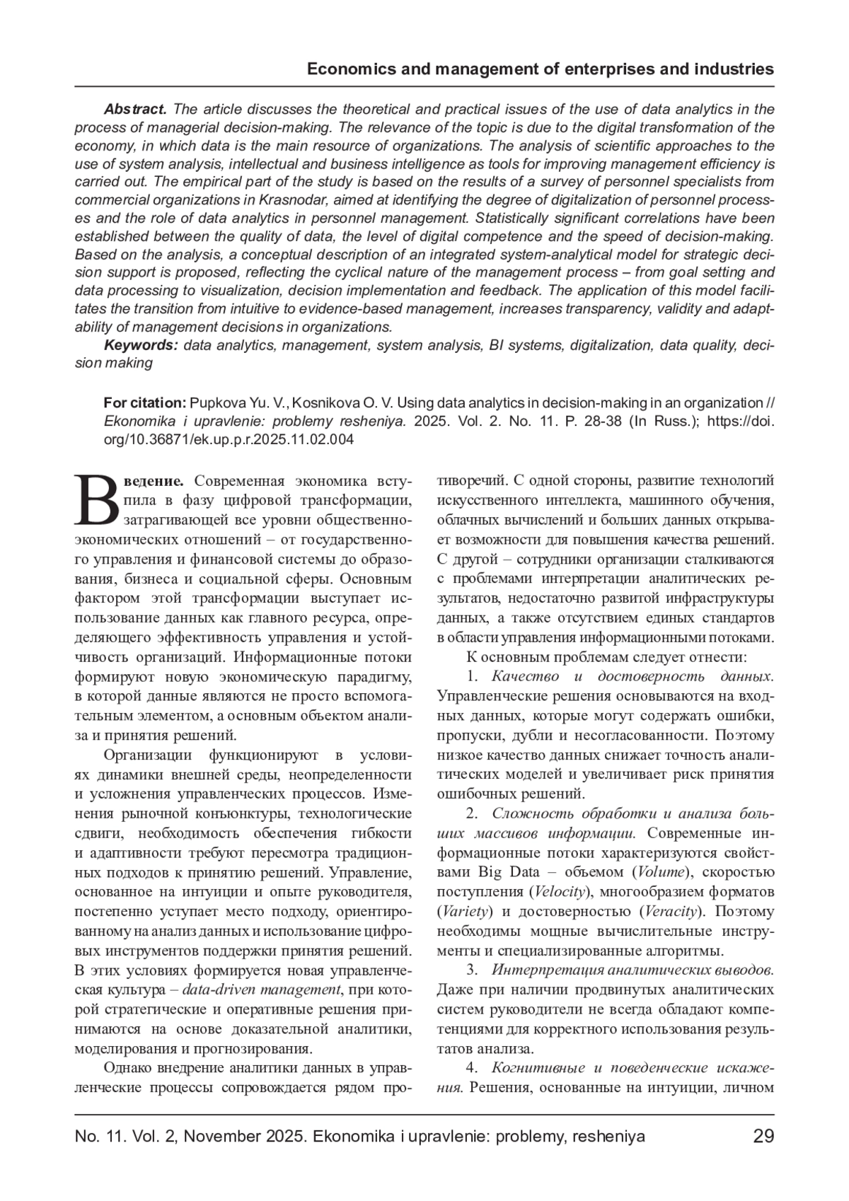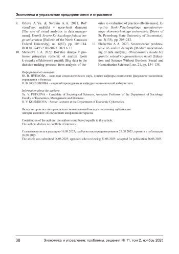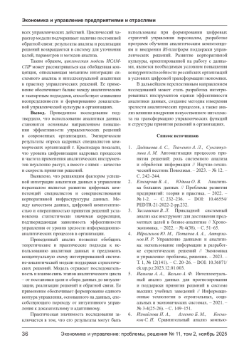 ПУПКОВА Ю. В., КОСНИКОВА О. В. ИСПОЛЬЗОВАНИЕ АНАЛИТИКИ ДАННЫХ ПРИ ПРИНЯТИИ РЕШЕНИЙ В ОРГАНИЗАЦИИ // ЭКОНОМИКА И УПРАВЛЕНИЕ: ПРОБЛЕМЫ, РЕШЕНИЯ. 2025. ТОМ 2 № 11
