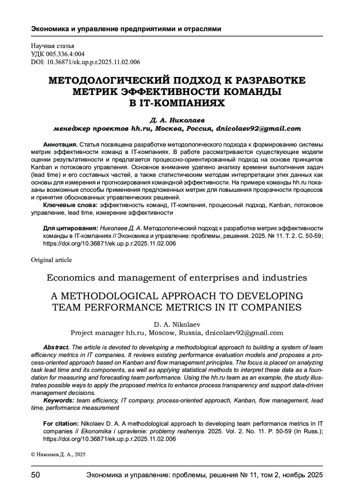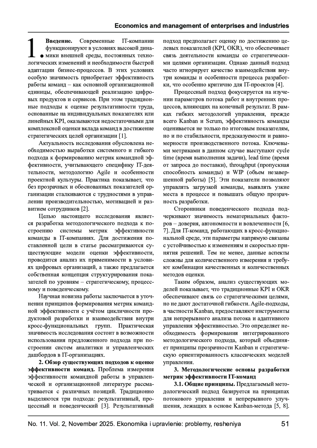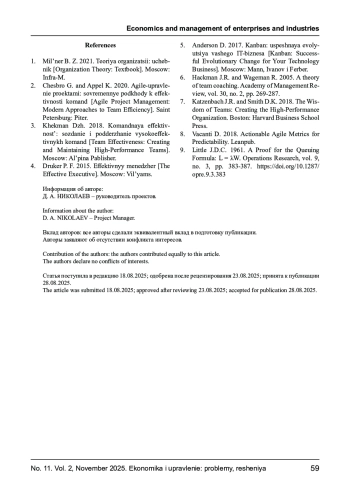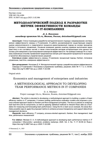 НИКОЛАЕВ Д. А. МЕТОДОЛОГИЧЕСКИЙ ПОДХОД К РАЗРАБОТКЕ МЕТРИК ЭФФЕКТИВНОСТИ КОМАНДЫ В IT-КОМПАНИЯХ // ЭКОНОМИКА И УПРАВЛЕНИЕ: ПРОБЛЕМЫ, РЕШЕНИЯ. 2025. ТОМ 2 № 11