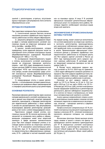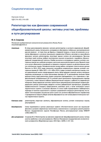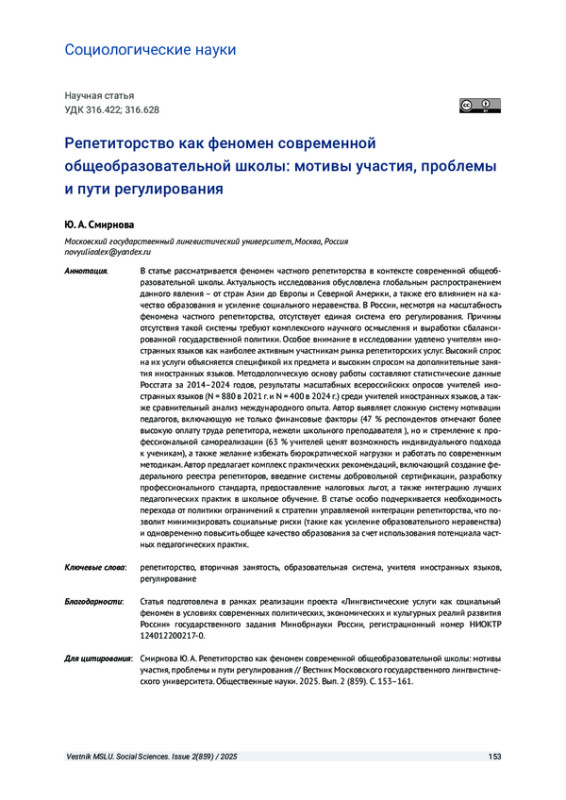 В статье рассматривается феномен частного репетиторства в контексте современной общеобразовательной школы. Актуальность исследования обусловлена глобальным распространением данного явления - от стран Азии до Европы и Северной Америки, а также его влиянием на качество образования и усиление социального неравенства. В России, несмотря на масштабность феномена частного репетиторства, отсутствует единая система его регулирования. Причины отсутствия такой системы требуют комплексного научного осмысления и выработки сбалансированной государственной политики. Особое внимание в исследовании уделено учителям иностранных языков как наиболее активным участникам рынка репетиторских услуг. Высокий спрос на их услуги объясняется спецификой их предмета и высоким спросом на дополнительные занятия иностранных языков. Методологическую основу работы составляют статистические данные Росстата за 2014-2024 годов, результаты масштабных всероссийских опросов учителей иностранных языков (N = 880 в 2021 г. и N = 400 в 2024 г.) среди учителей иностранных языков, а также сравнительный анализ международного опыта. Автор выявляет сложную систему мотивации педагогов, включающую не только финансовые факторы (47 % респондентов отмечают более высокую оплату труда репетитора, нежели школьного преподавателя ), но и стремление к профессиональной самореализации (63 % учителей ценят возможность индивидуального подхода к ученикам), а также желание избежать бюрократической нагрузки и работать по современным методикам. Автор предлагает комплекс практических рекомендаций, включающий создание федерального реестра репетиторов, введение системы добровольной сертификации, разработку профессионального стандарта, предоставление налоговых льгот, а также интеграцию лучших педагогических практик в школьное обучение. В статье особо подчеркивается необходимость перехода от политики ограничений к стратегии управляемой интеграции репетиторства, что позволит минимизировать социальные риски (такие как усиление образовательного неравенства) и одновременно повысить общее качество образования за счет использования потенциала частных педагогических практик.