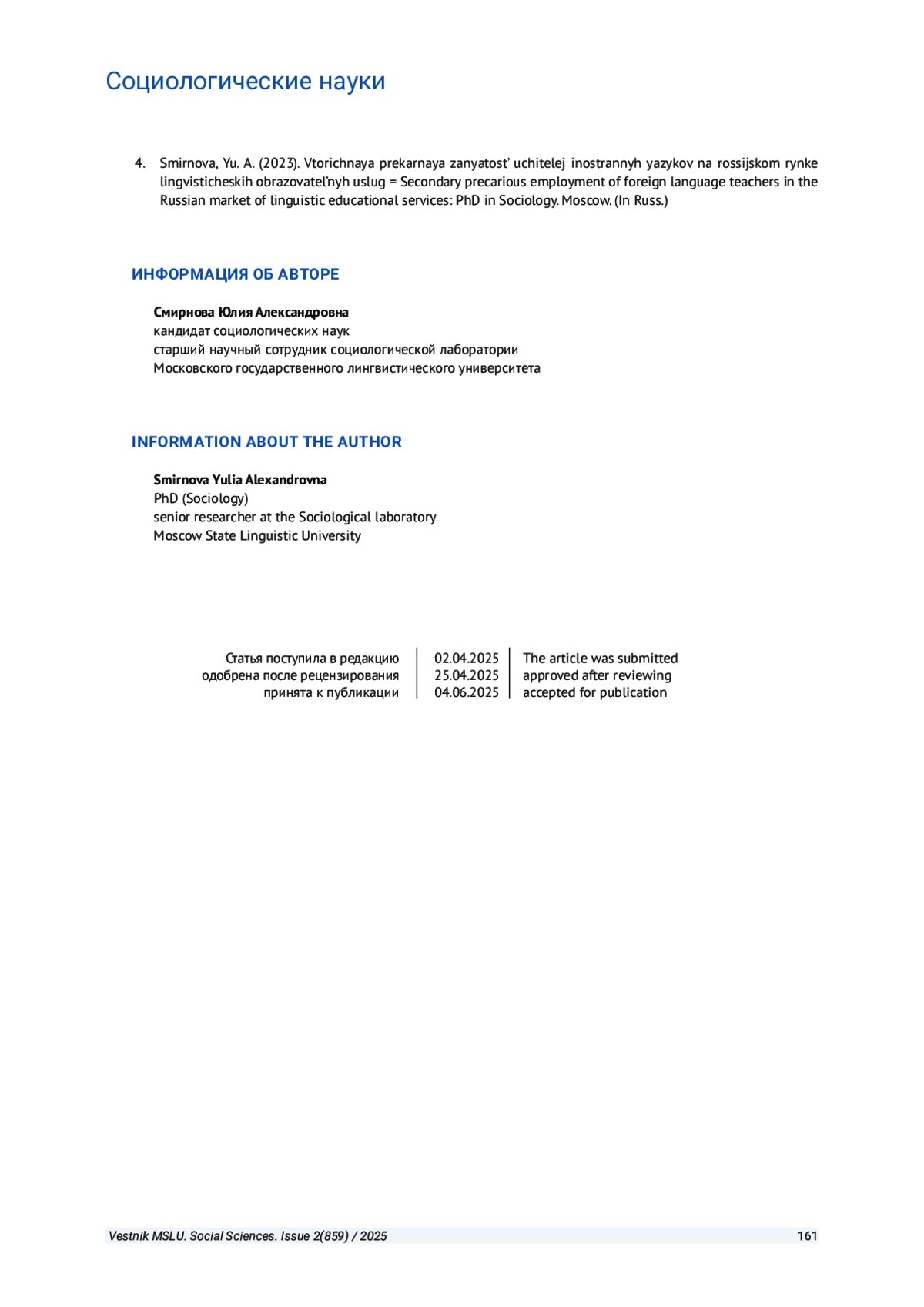 4. Смирнова Ю. А. Вторичная прекарная занятость учителей иностранных языков на российском рынке лингвистических образовательных услуг: дис.. канд. социол. наук. М., 2023. EDN: NVSUFS