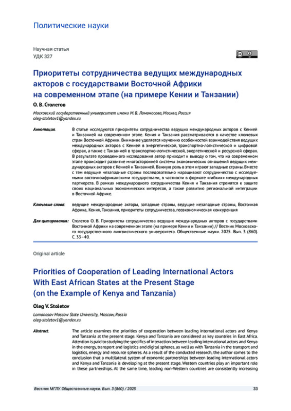 В статье исследуются приоритеты сотрудничества ведущих международных акторов с Кенией и Танзанией на современном этапе. Кения и Танзания рассматриваются в качестве ключевых стран Восточной Африки. Внимание уделяется изучению особенностей взаимодействия ведущих международных акторов с Кенией в энергетической, транспортно-логистической и цифровой сферах, а также с Танзанией в транспортно-логистической, энергетической и ресурсной сферах. В результате проведенного исследования автор приходит к выводу о том, что на современном этапе происходит развитие многосторонней системы экономических отношений ведущих международных акторов с Кенией и Танзанией. Важную роль в этом играют западные страны. Вместе с тем ведущие незападные страны последовательно наращивают сотрудничество с исследуемыми восточноафриканскими государствами, в частности в формате «гибких» международных партнерств. В рамках международного сотрудничества Кения и Танзания стремятся к защите своих национальных экономических интересов, а также развитию региональной интеграции в Восточной Африке.