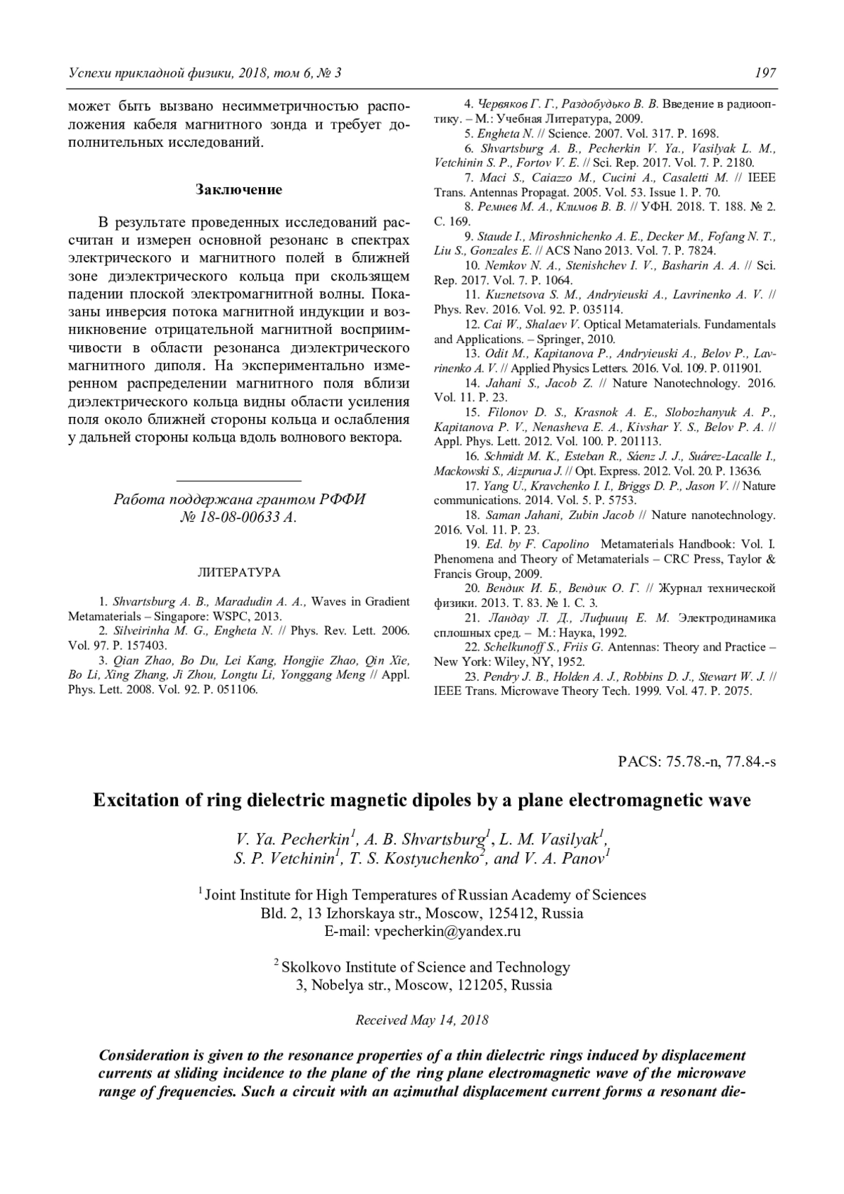 Excitation of ring dielectric magnetic dipoles by a plane electromagnetic wave V. Ya. Pecherkin, A. B. Shvartsburg, L. M. Vasilyak, S. P. Vetchinin, T. S. Kostyuchenko, and V. A. Panov 191